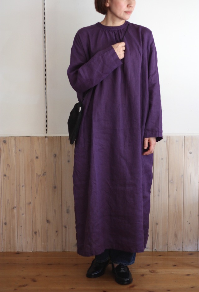 シンプルながら、バックスタイルの襟ぐりのタイが印象的なワンピース。 タイはリボン結びにしたり、片結びにしたりと、お好みのバランスで着用いただけます。 襟元には細やかなギャザーを寄せ、ほどよくふんわりとしたボリューム感をプラス。 ドロップショルダーとゆったりとした身幅でリラックスした着心地ながら、詰まったバンドカラーが上品な雰囲気に。 すとんと落ちるシルエットで、大人っぽさの中に華やかさを添える一枚です。両サイドポケット付き。 fog linen work アリアナ ワンピース 30250円税込 ミュール--アヤメのような鮮やかなパープル 着丈 106 × 胸囲 128 × 袖丈 47 × 肩幅 58 cm 店内撮影モデル身長158cm モデル身長 175cm 日本人モデル身長161cm linen 100%(薄地) made in Lithuania ○ワンウォッシュ加工