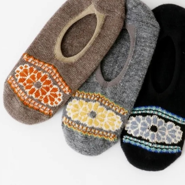 多色で華やかな飾りをイメージした柄のソックスです。 カラーは、ブラウン・グレー・ブラックの3色展開です。 履き口はゴムで編み立て、優しいフィット感と脱げにくさを両立させました。 タイツなどに重ねて冷え対策や、ルームソックスとしても◎ 冬の贈り物にもおすすめです。 French bull デコールカバー 1870円税込 ブラウン グレー ブラック 23cm~25cm ウール49% 綿17% ナイロン17% ポリエステル9% レーヨン5% カシミヤ2% ポリウレタン1%