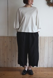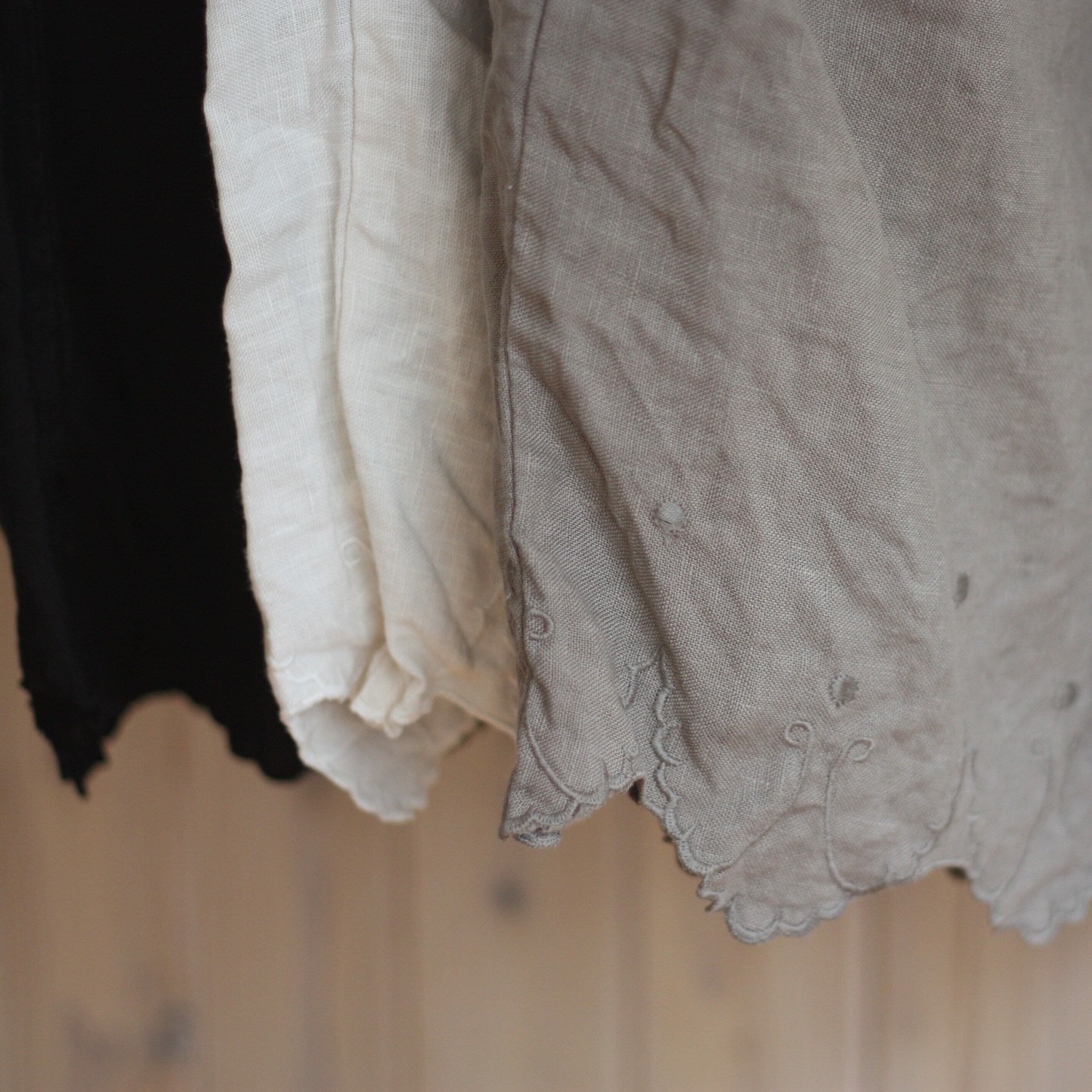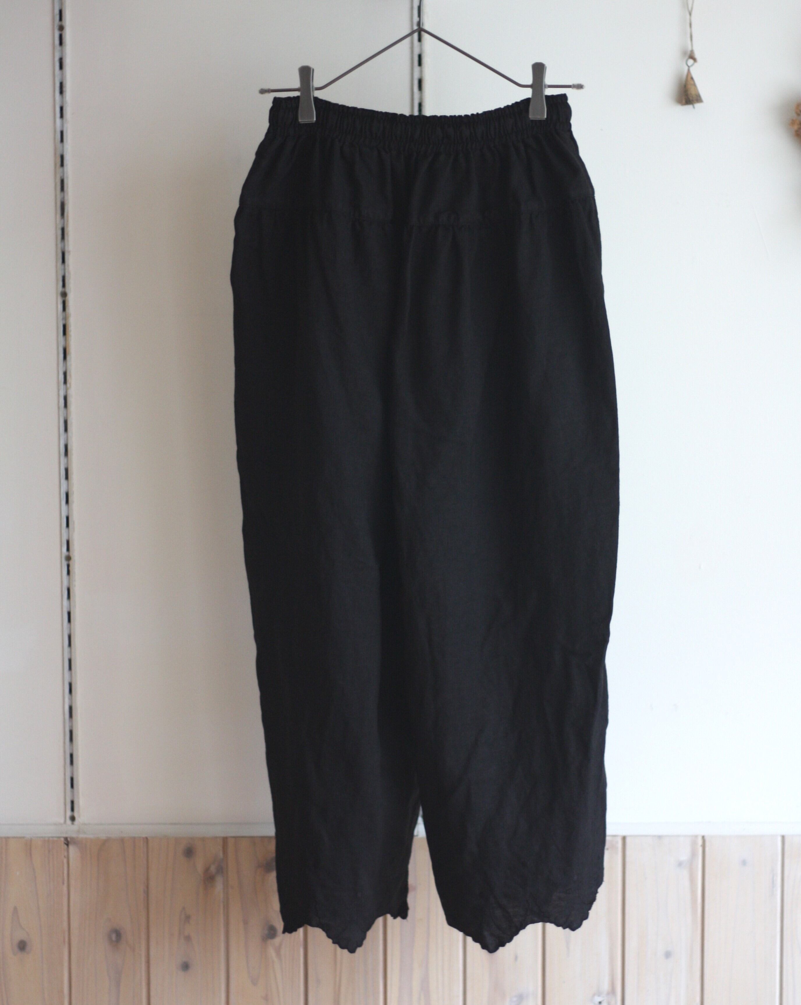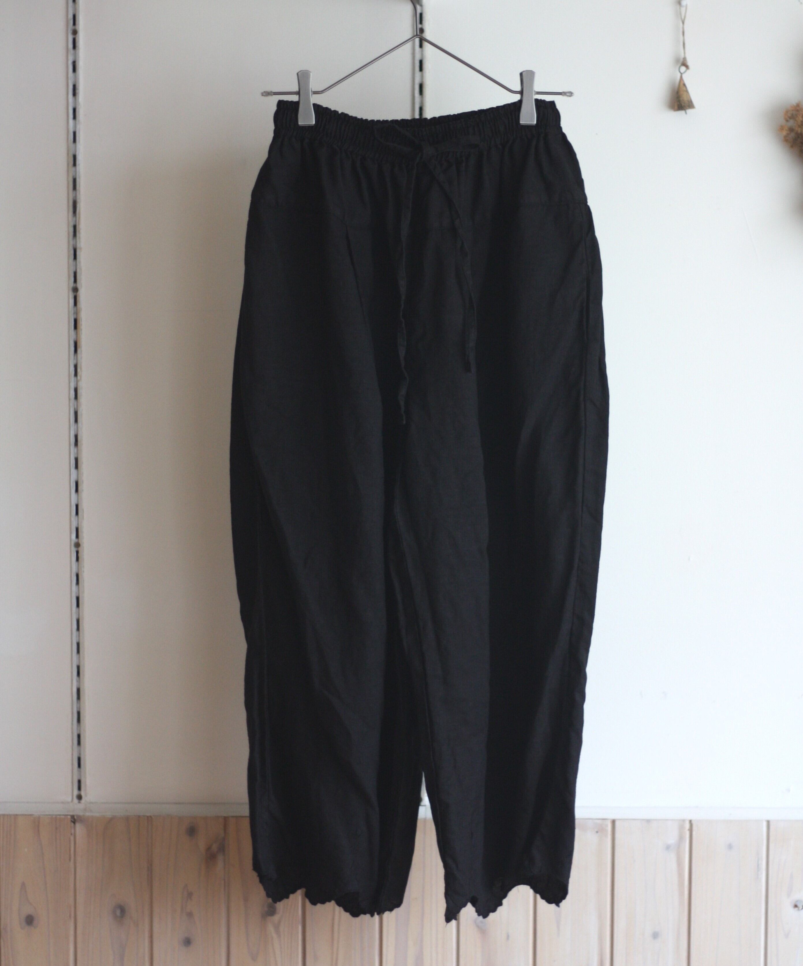 贅沢なリネン使いと裾にあしらわれた繊細なスカラップレースが魅力的なワイドパンツ。