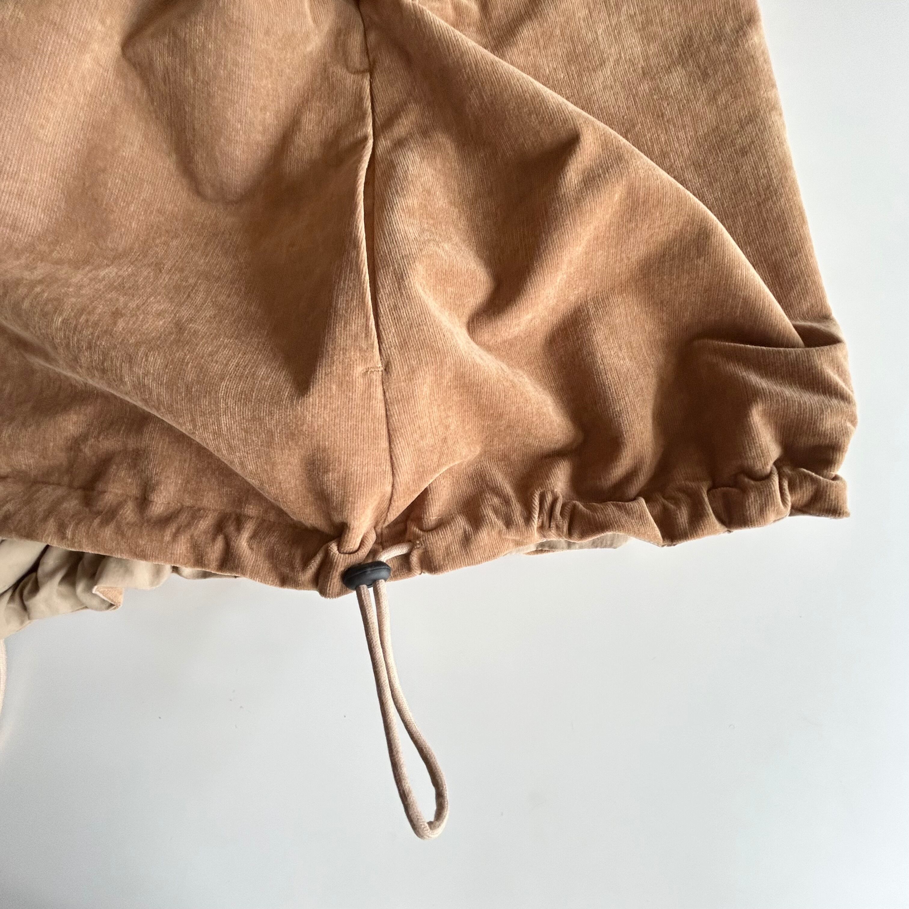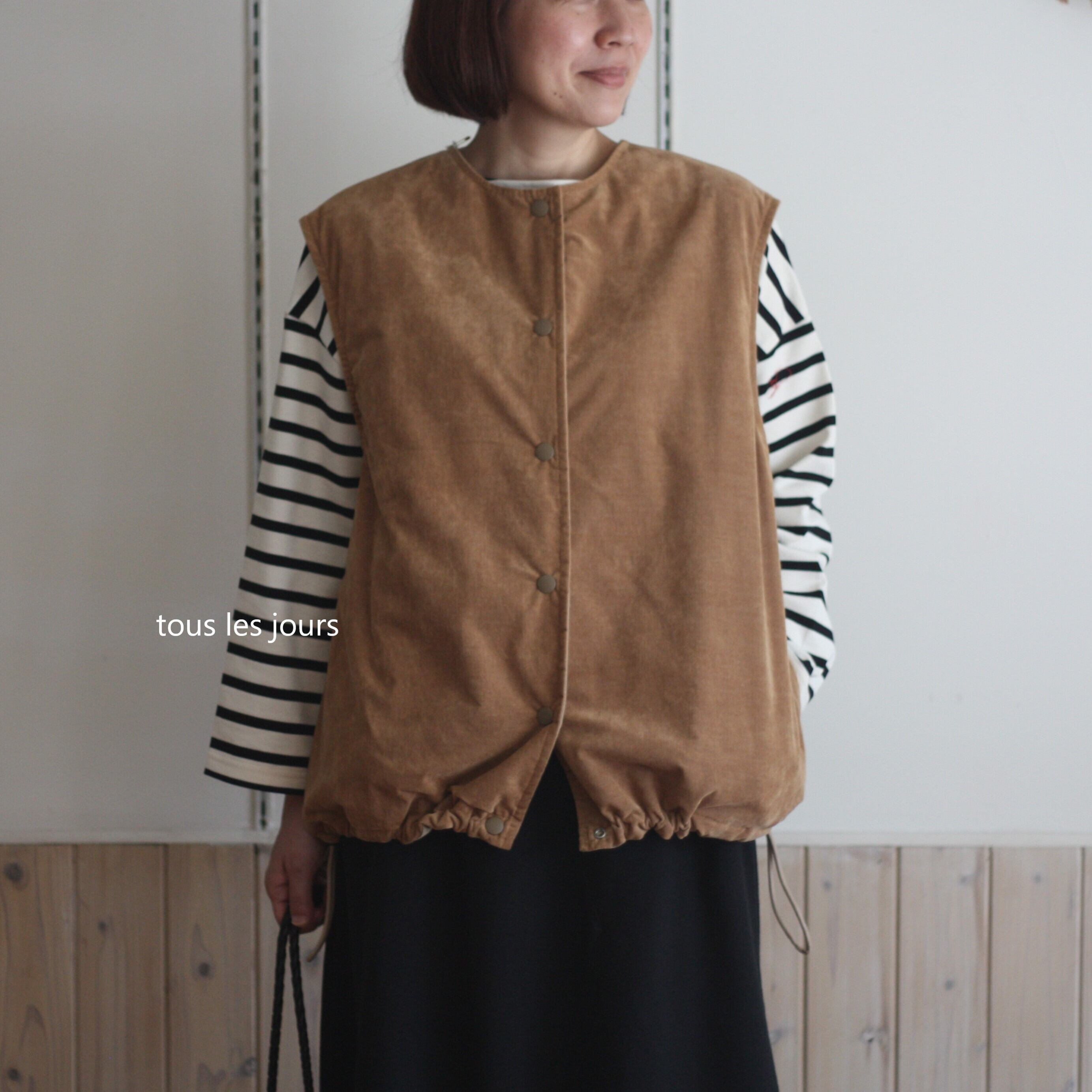 片面は柔らかくふくらみのあるコーデュロイ生地とナイロン生地のリバーシブルベスト。