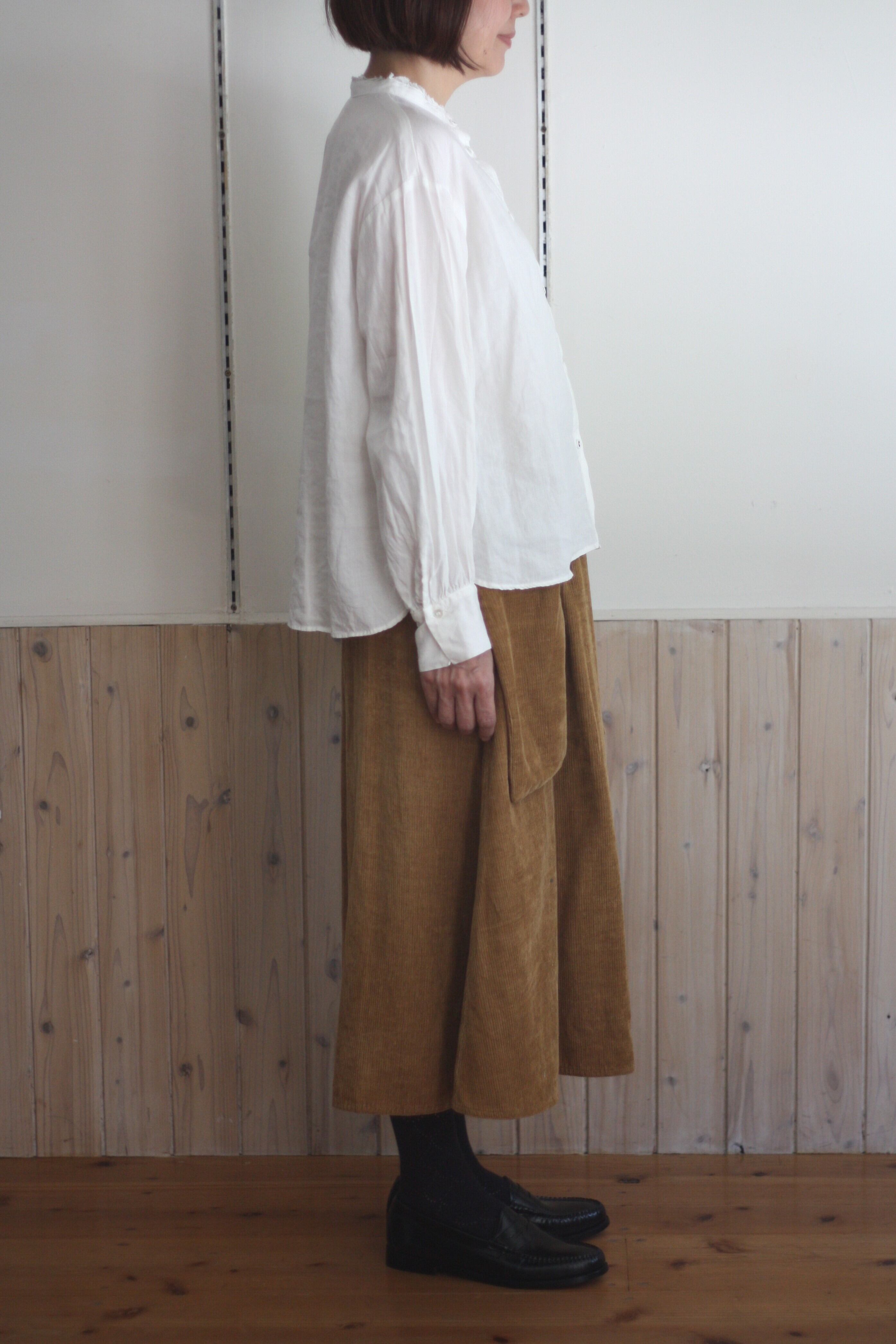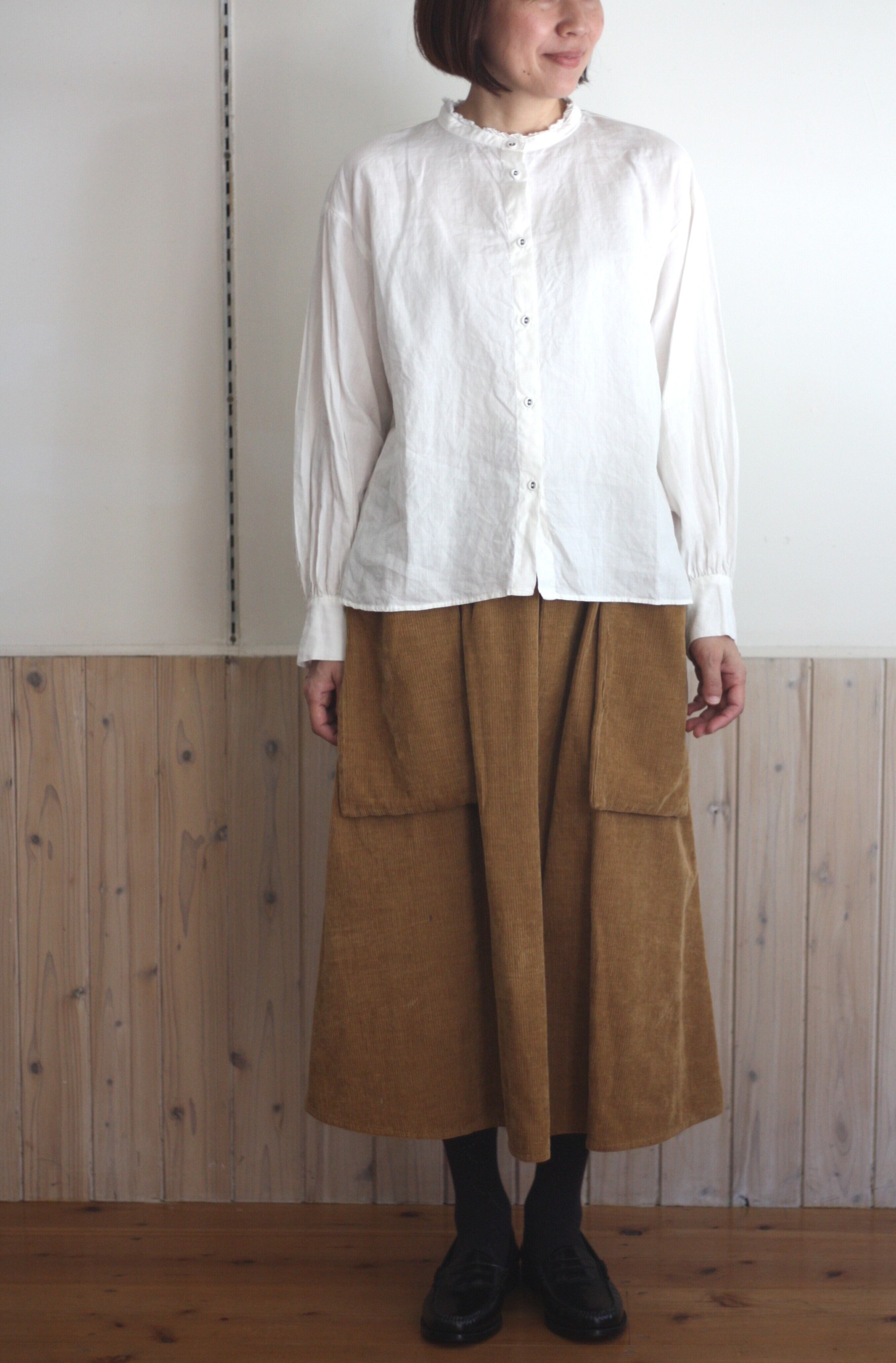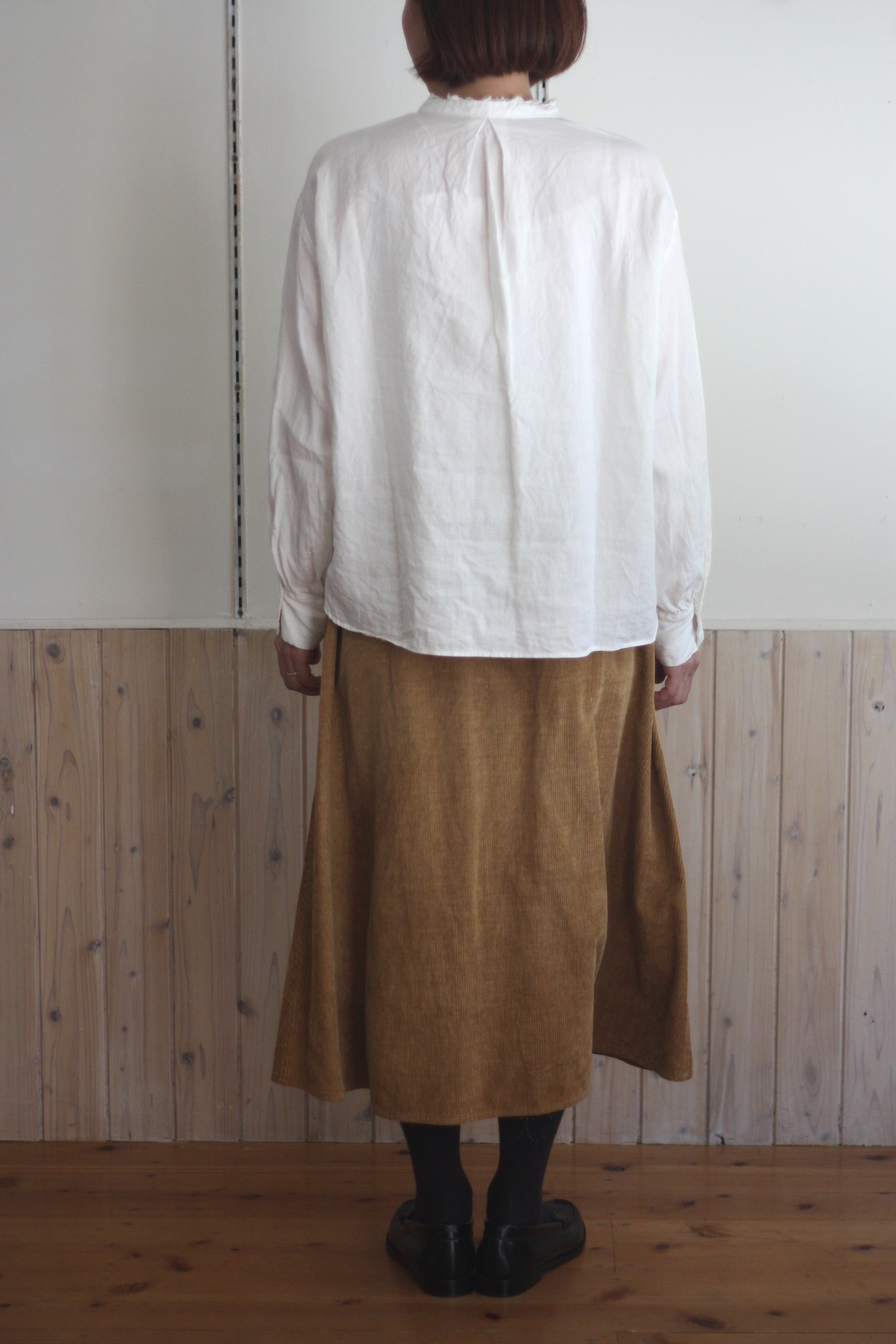 シンプルな面持ちのブラウスですが、柔らかなラミーリネンを使用しており、肌触りが良く、通気性も抜群、シルクを配合することで、さらっとした着心地とワンランク上の着心地に。