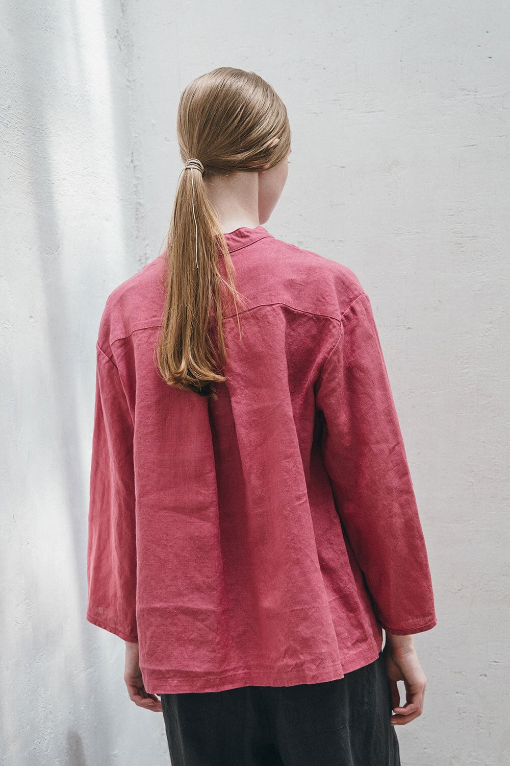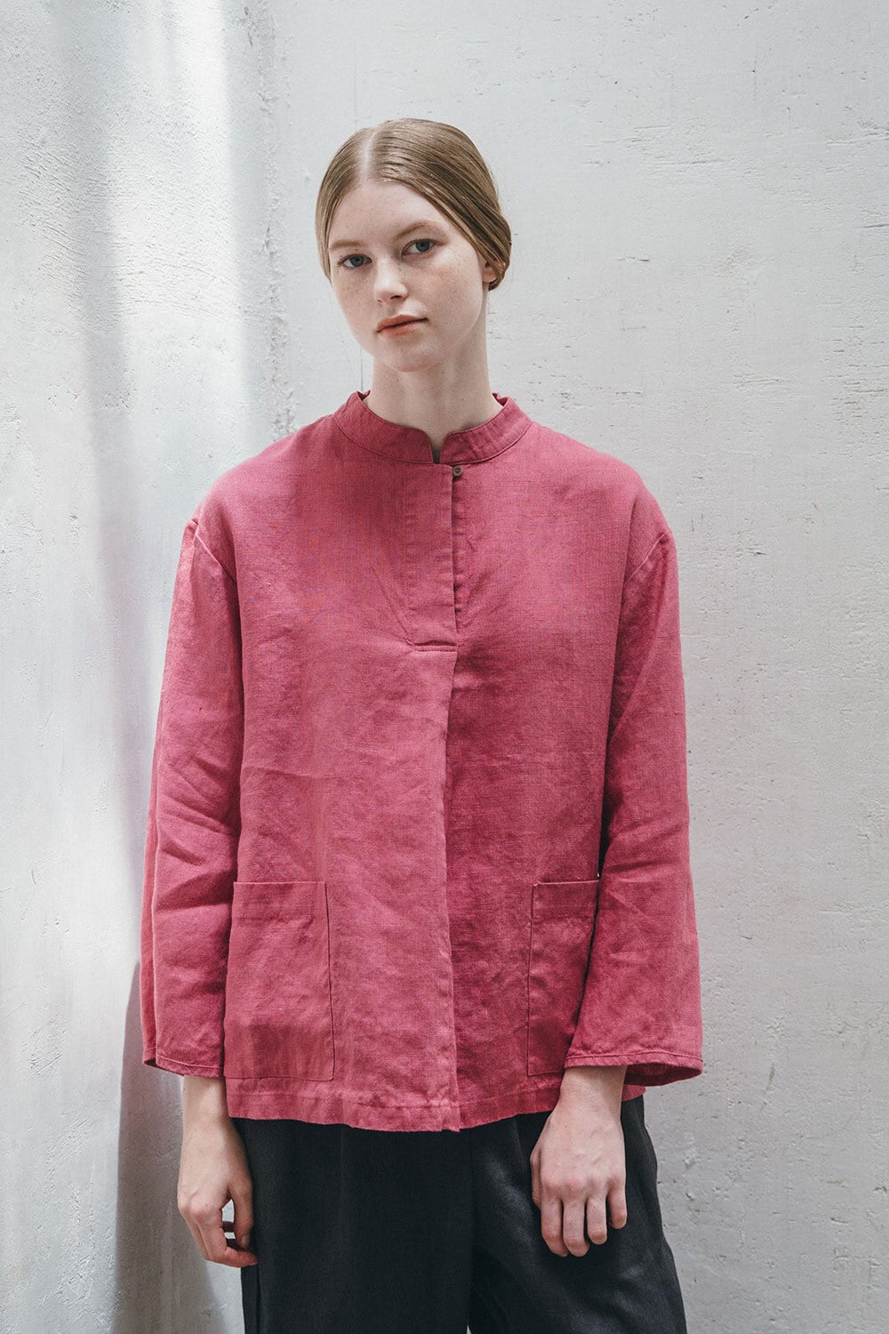 <小さなボタンと大きなポケットがアクセント。バンドカラーのプルオーバー>