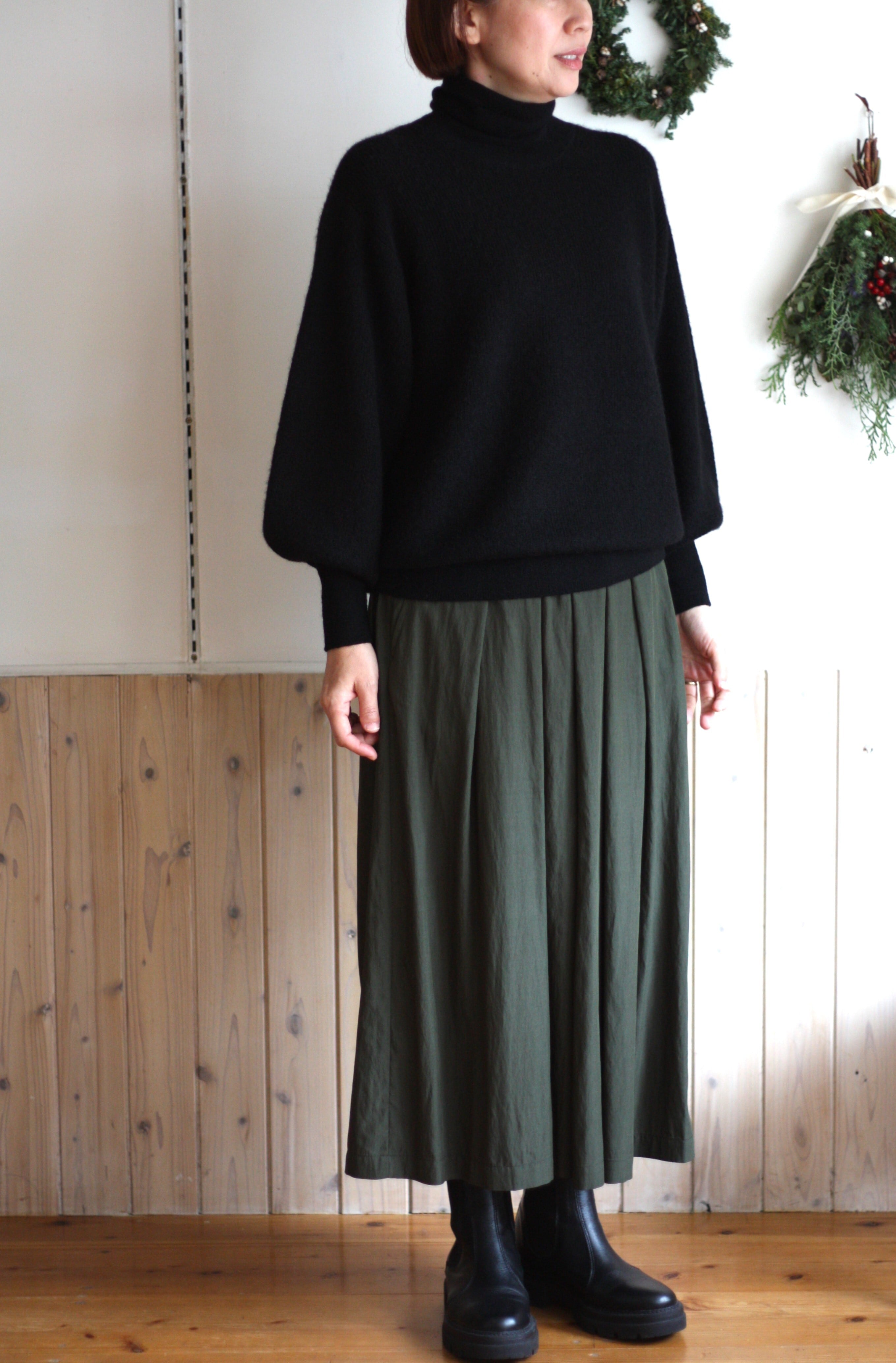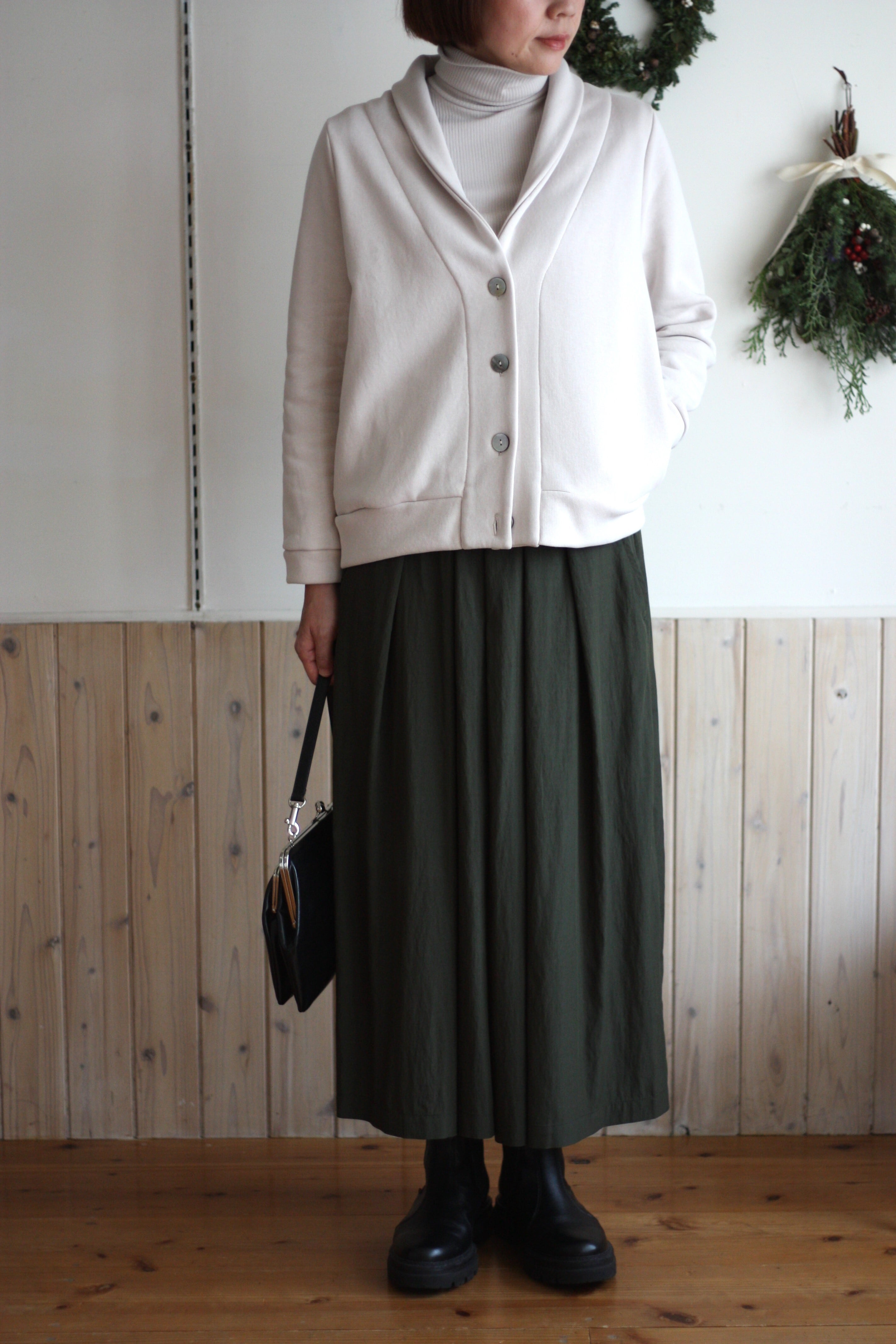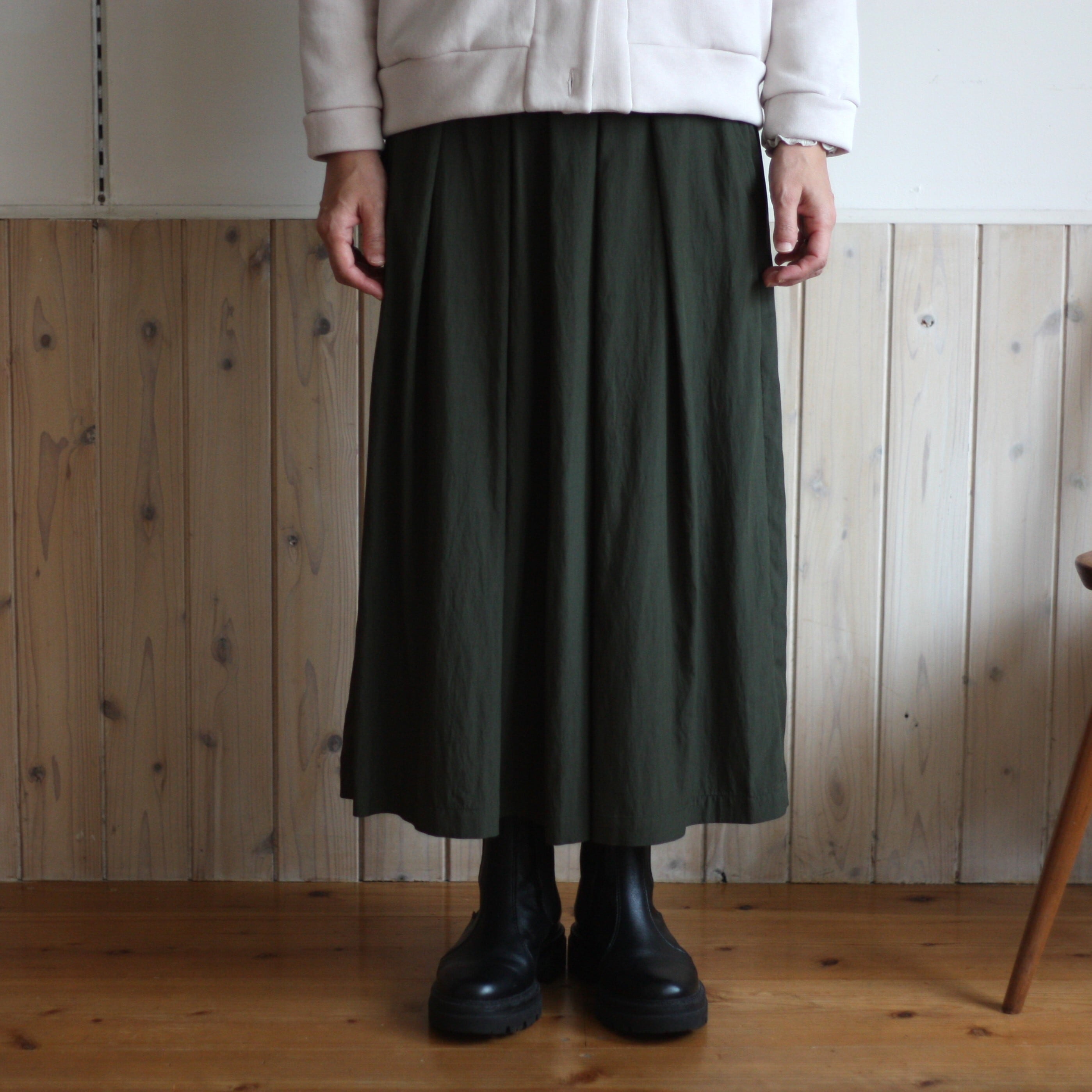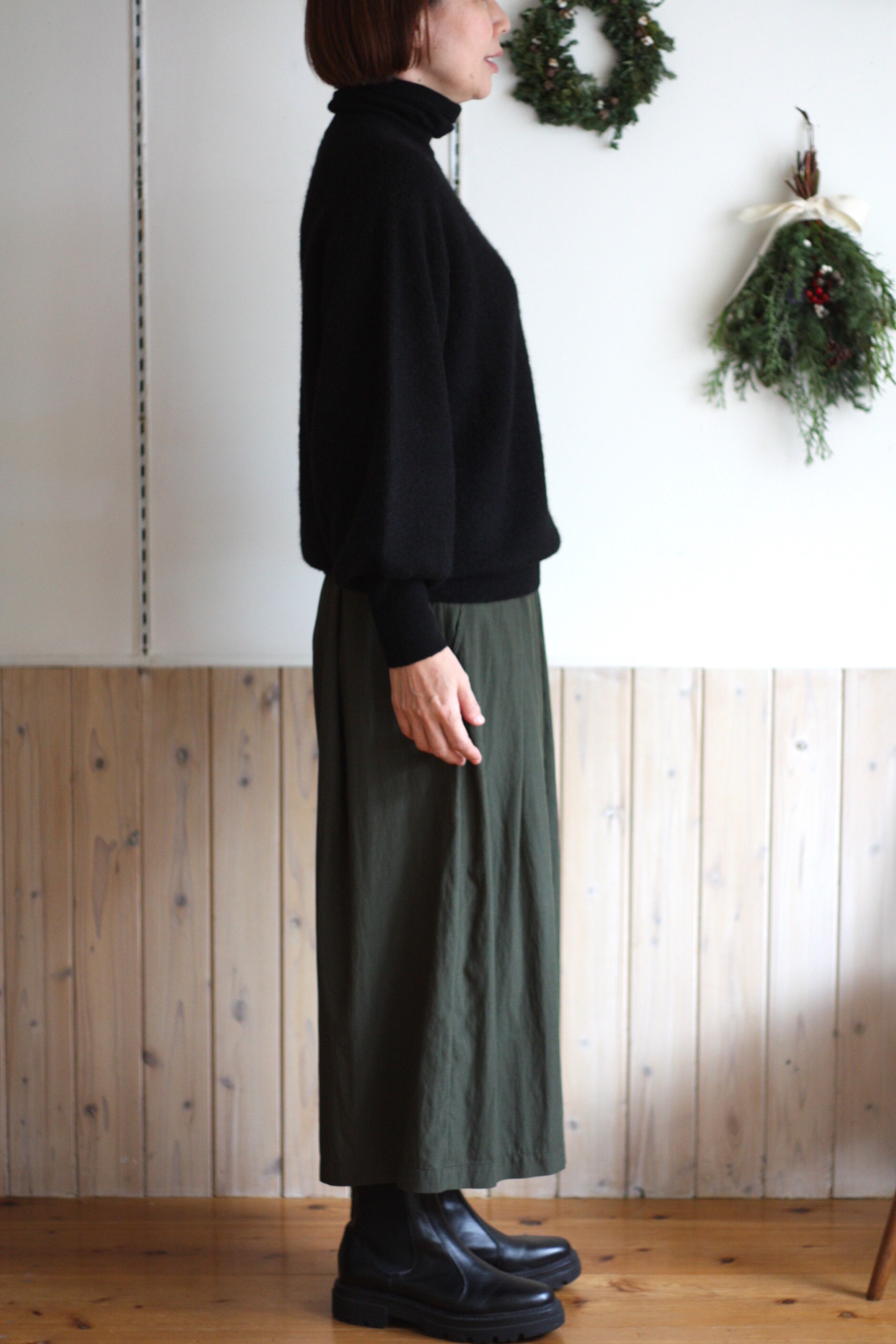 ウエストから裾に向かい広がり、体のラインを拾いすぎず、すっきりとしたバランスで着ていただけます。