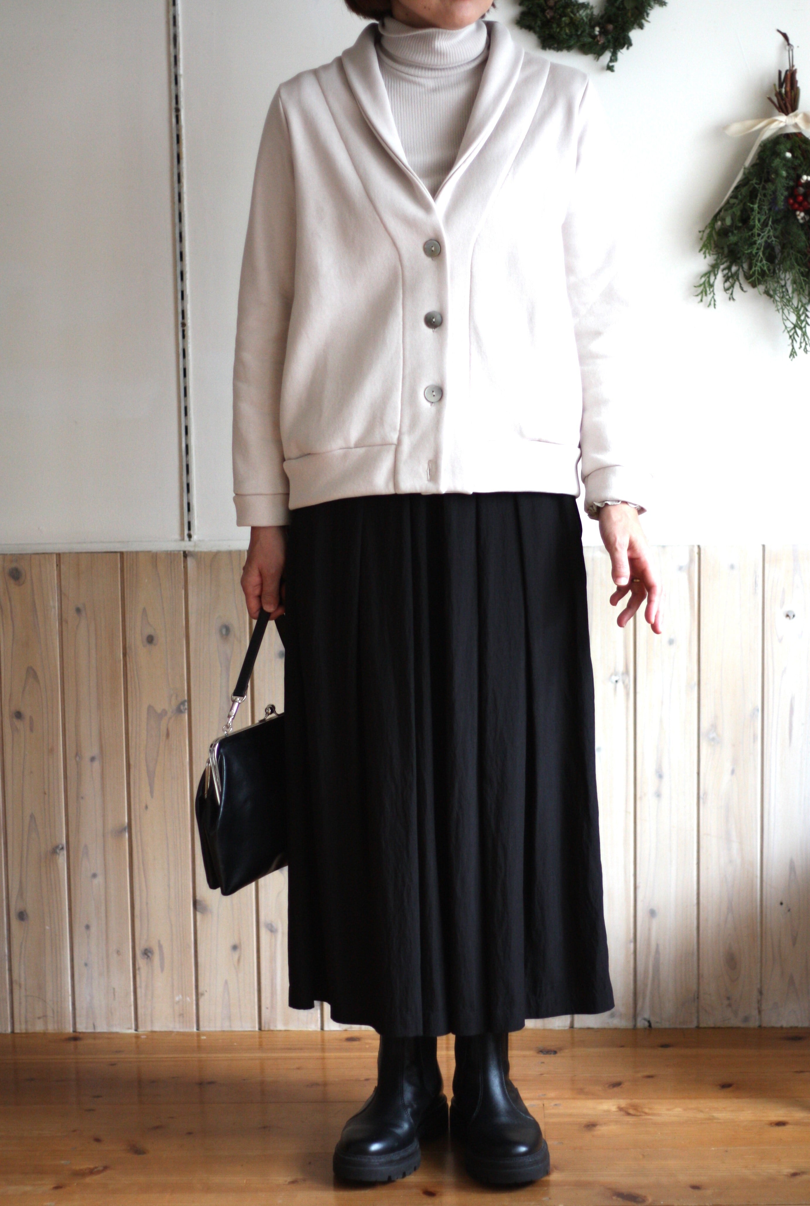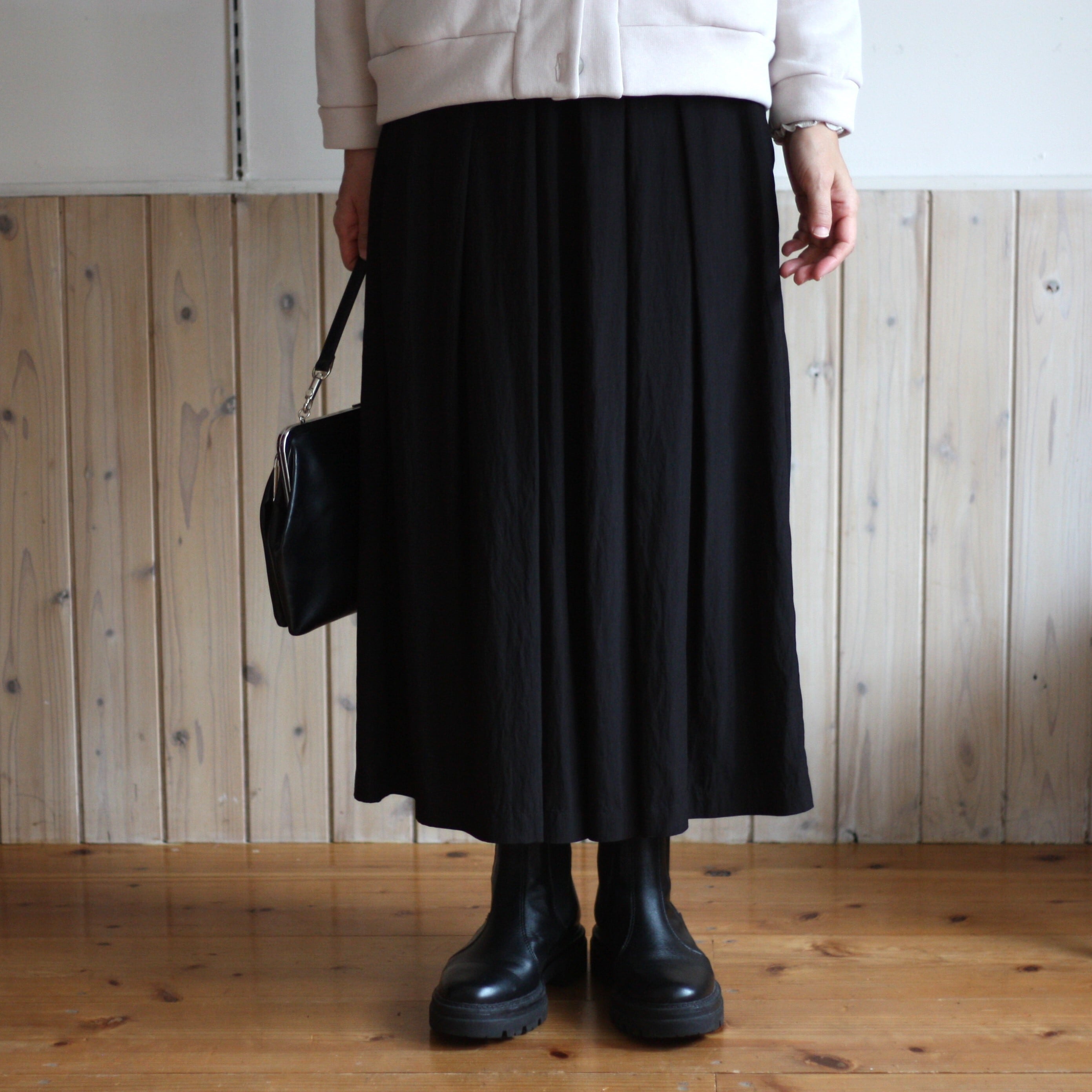 ウエストから裾に向かい広がり、体のラインを拾いすぎず、すっきりとしたバランスで着ていただけます。