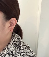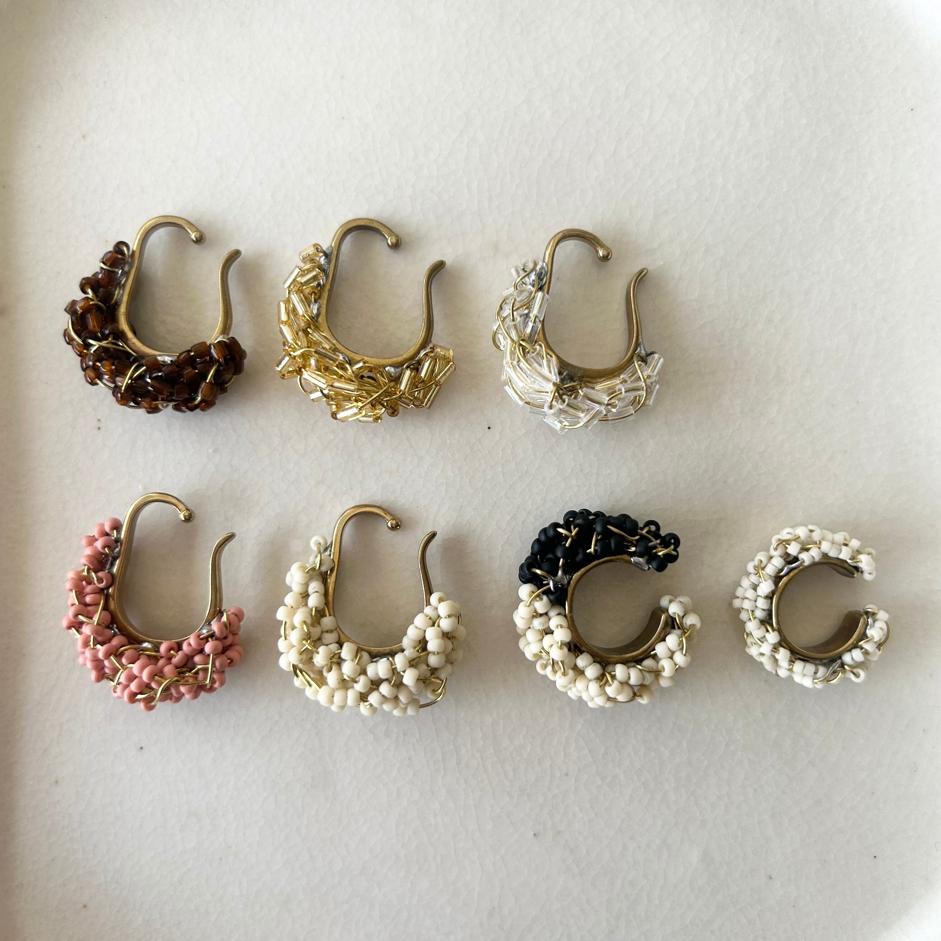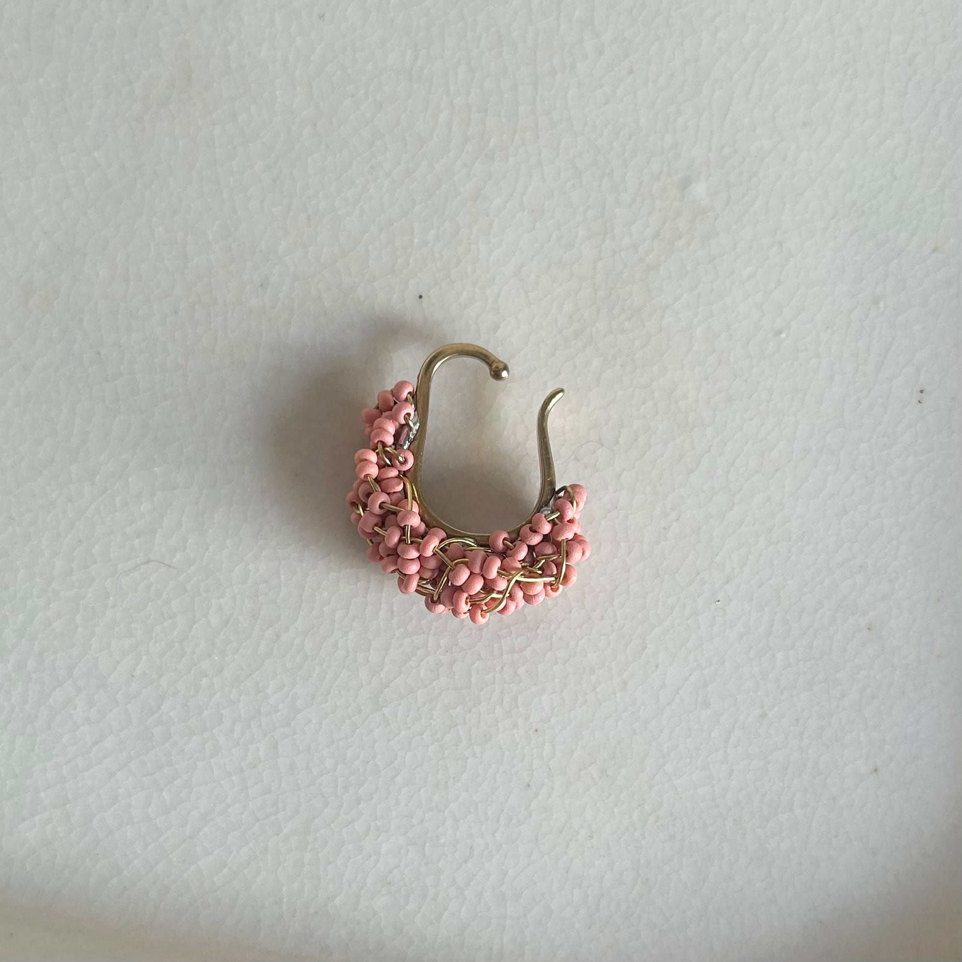 柔らかいトーンのくすんだピンク色のビーズに真鍮のワイヤーで仕立てられたイヤーカフです