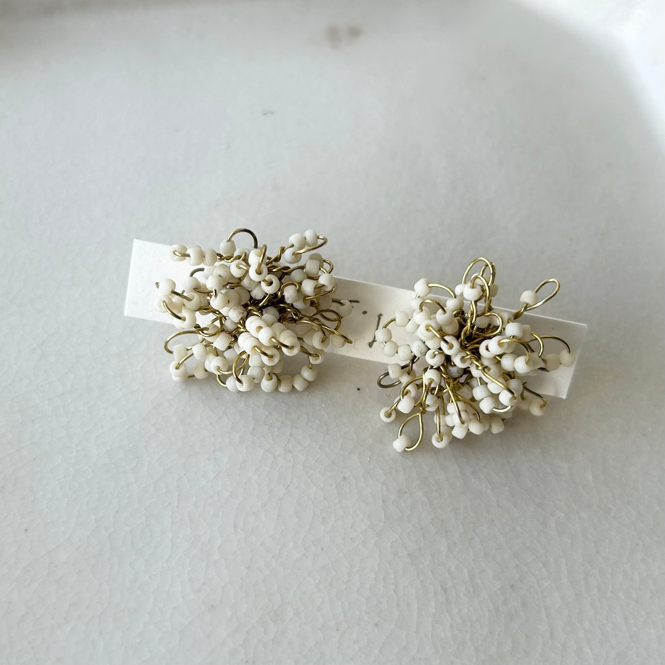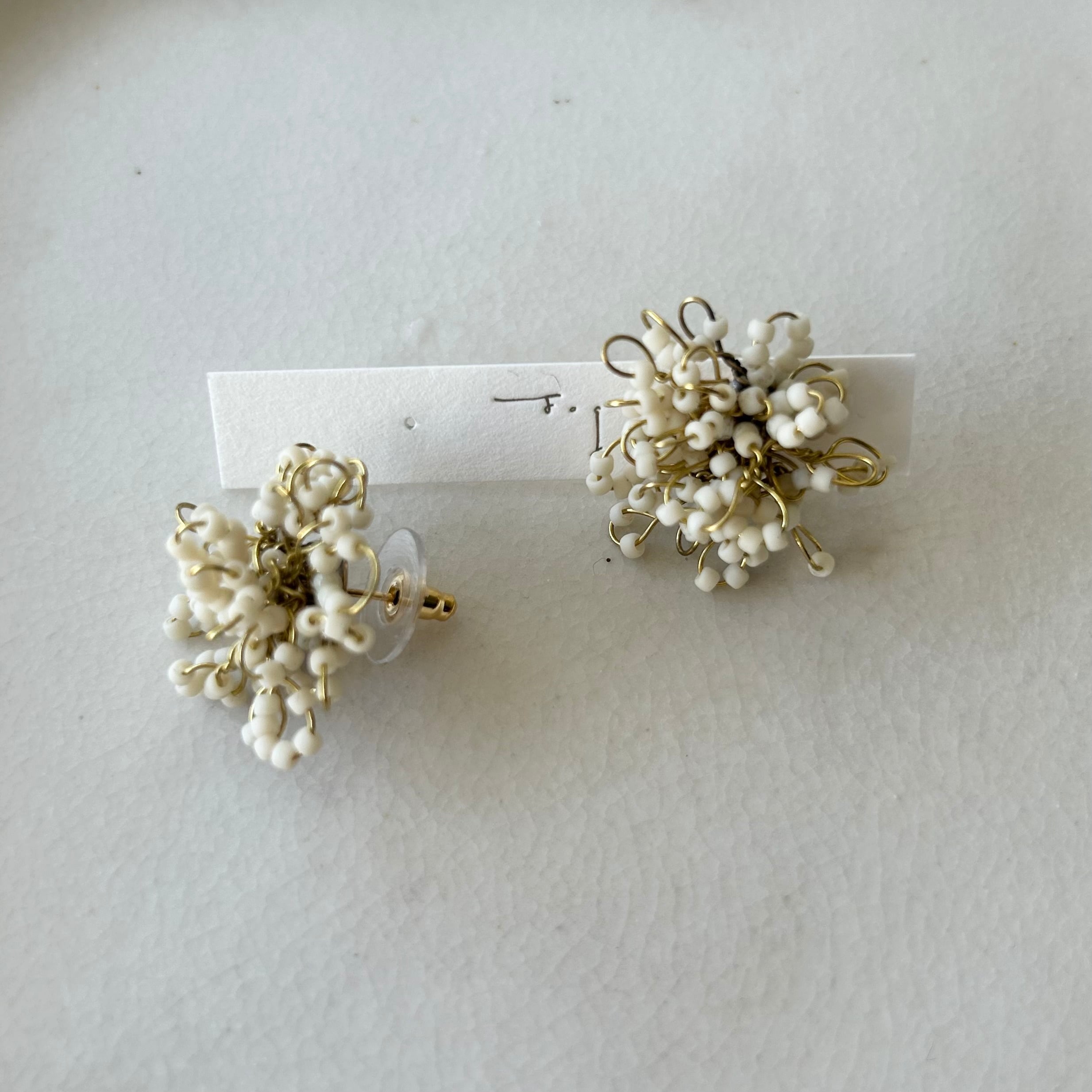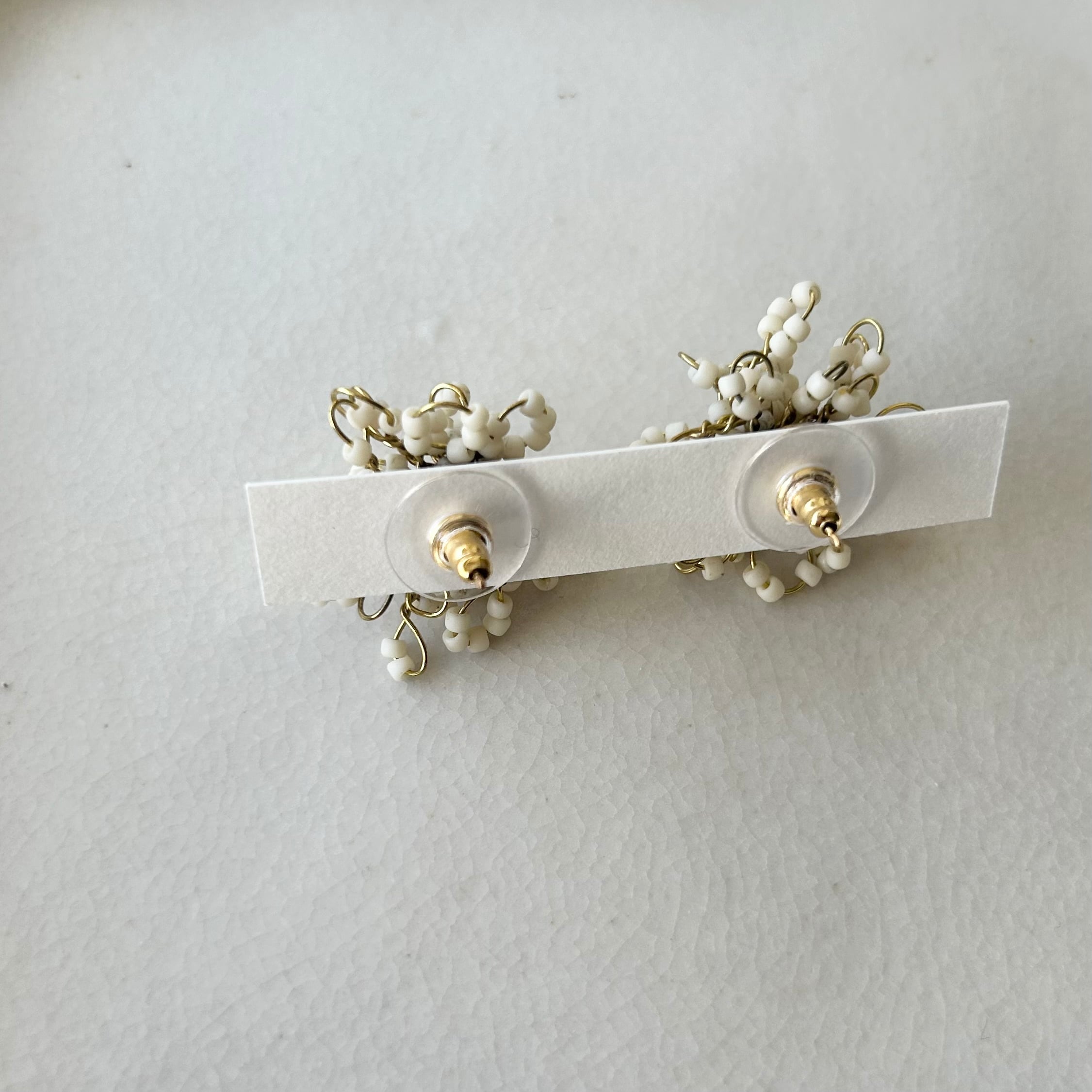乳白色のビーズにゴールドのワイヤーでパーツを仕立てられたピアス