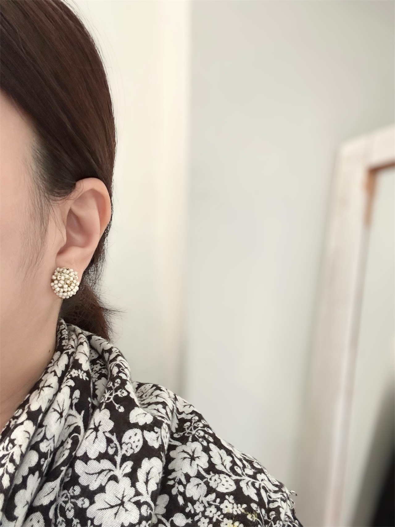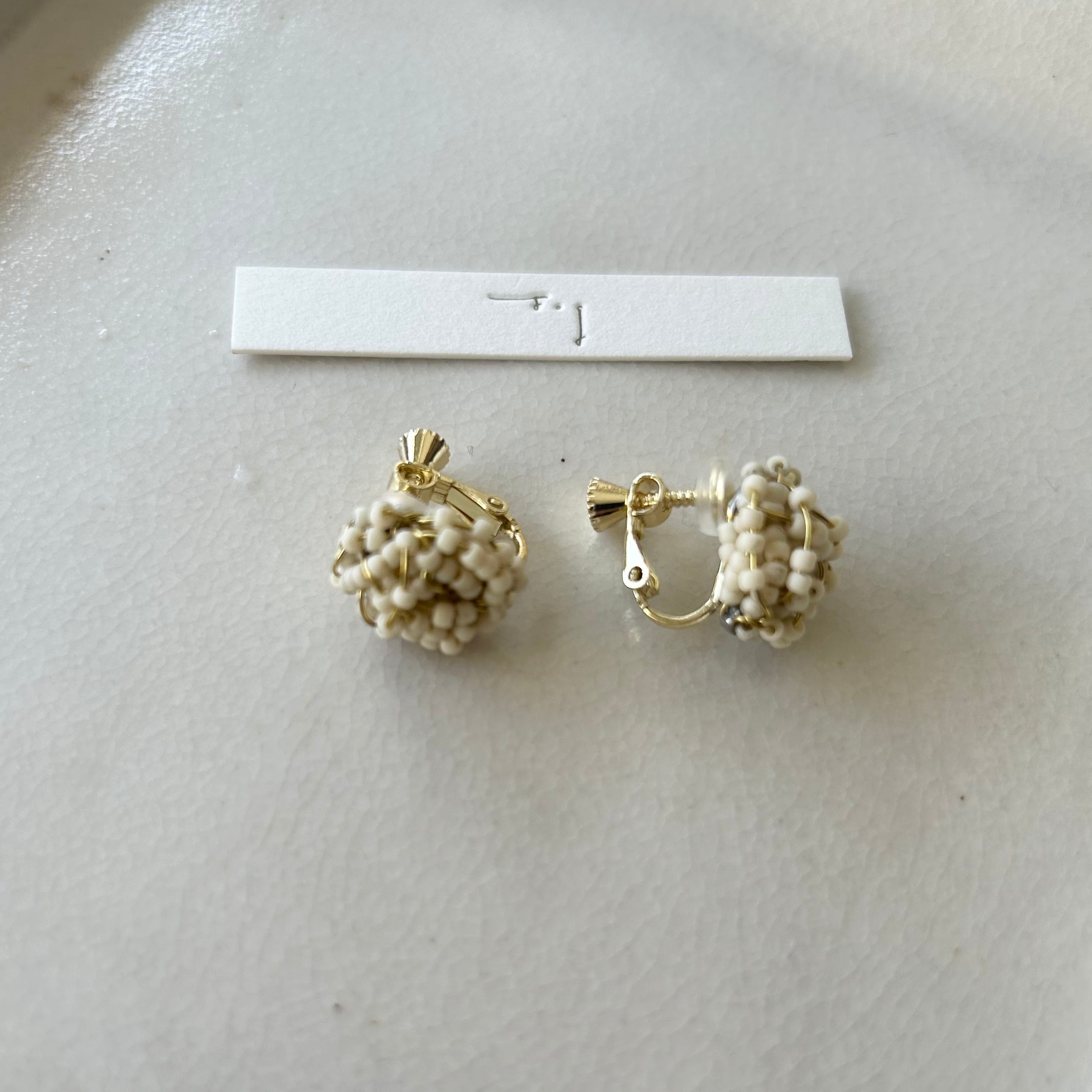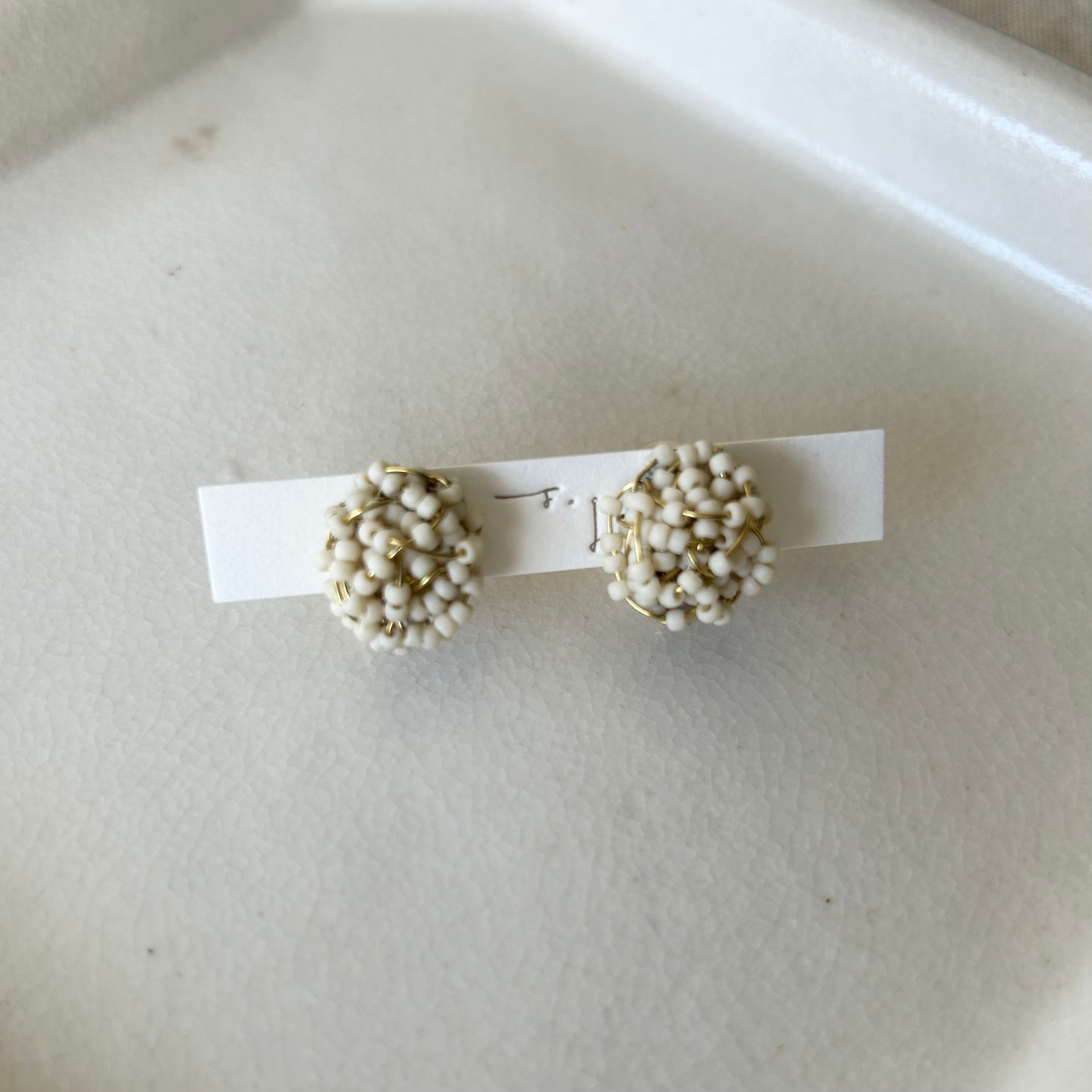 乳白色のビーズにゴールドのワイヤーでパーツを仕立てられたイヤリングです