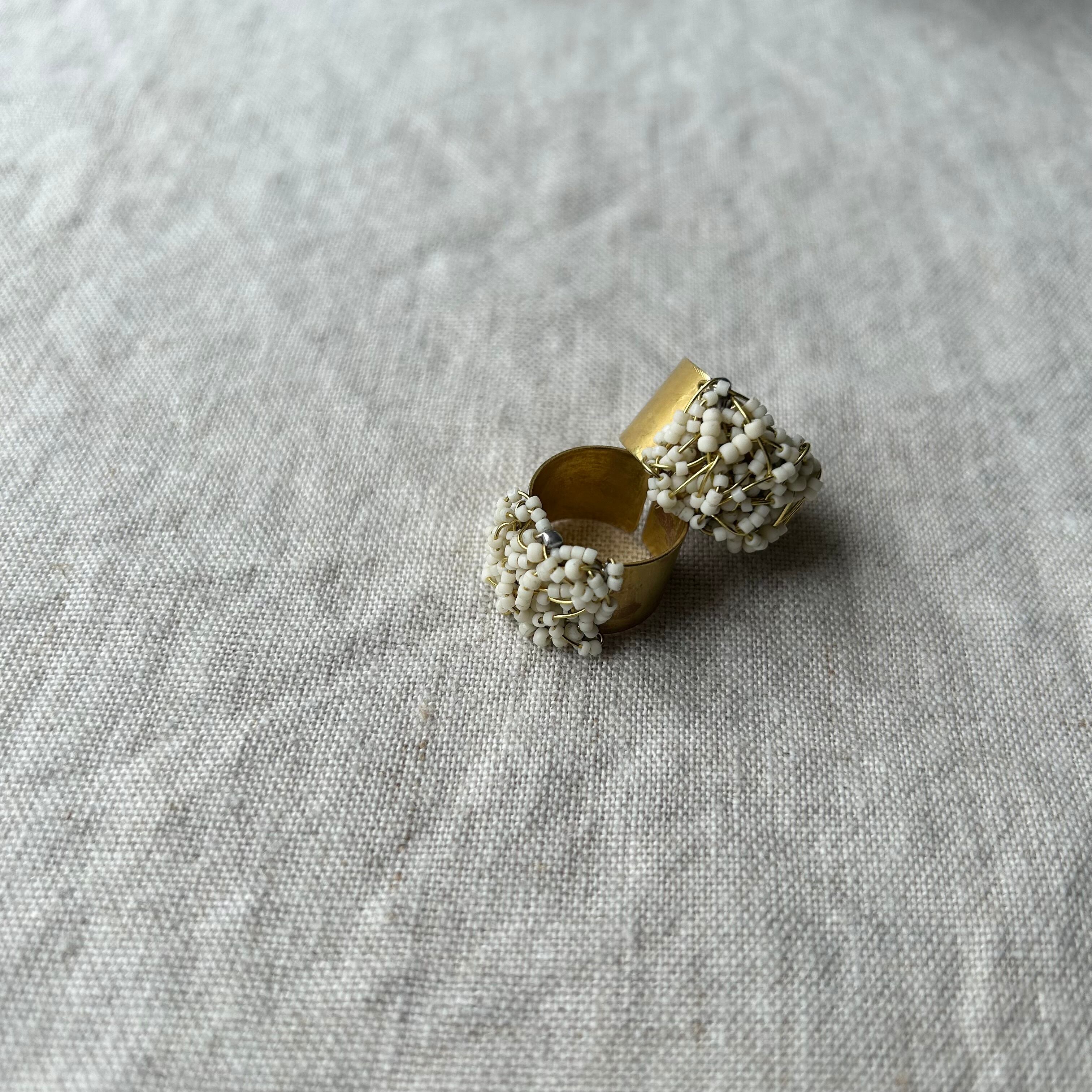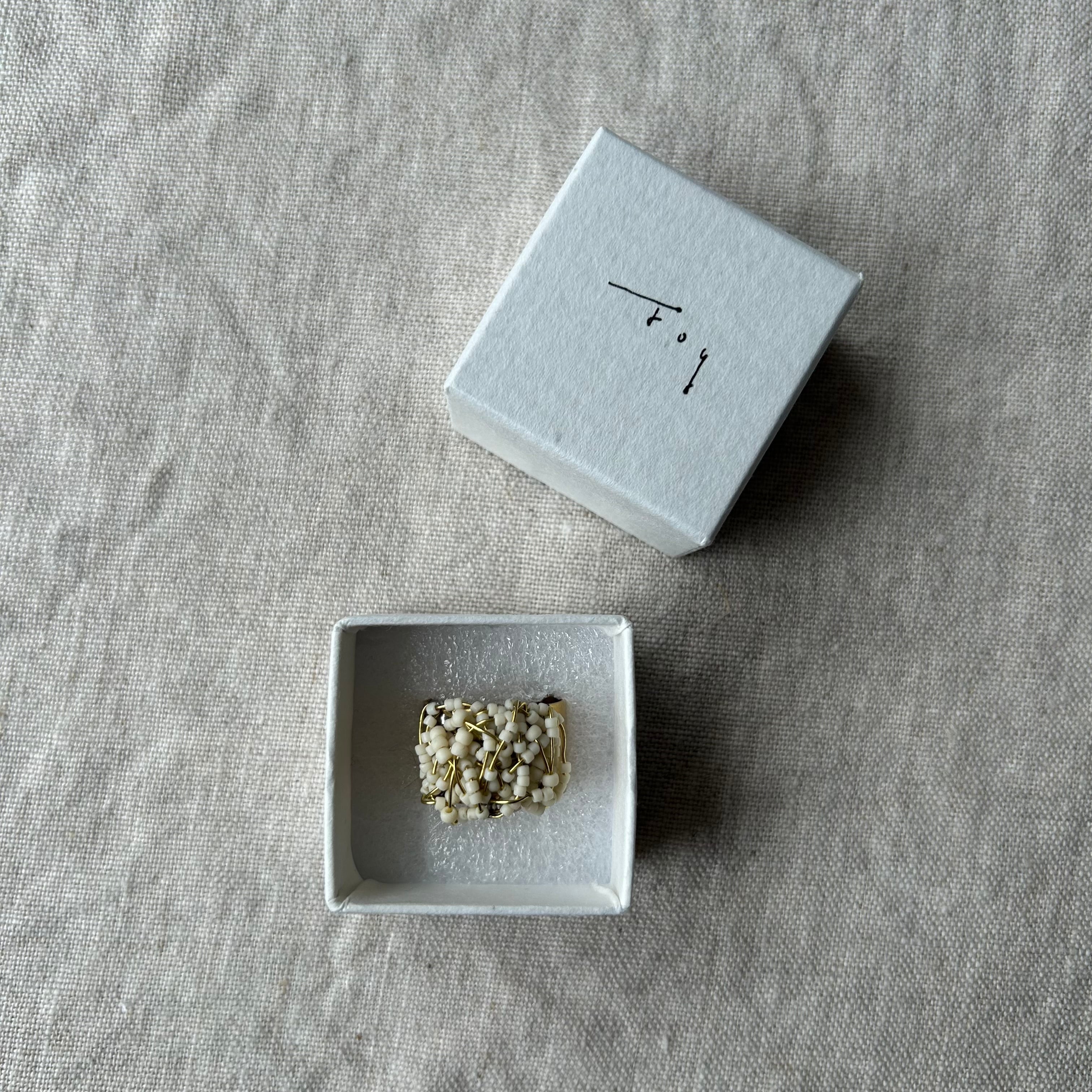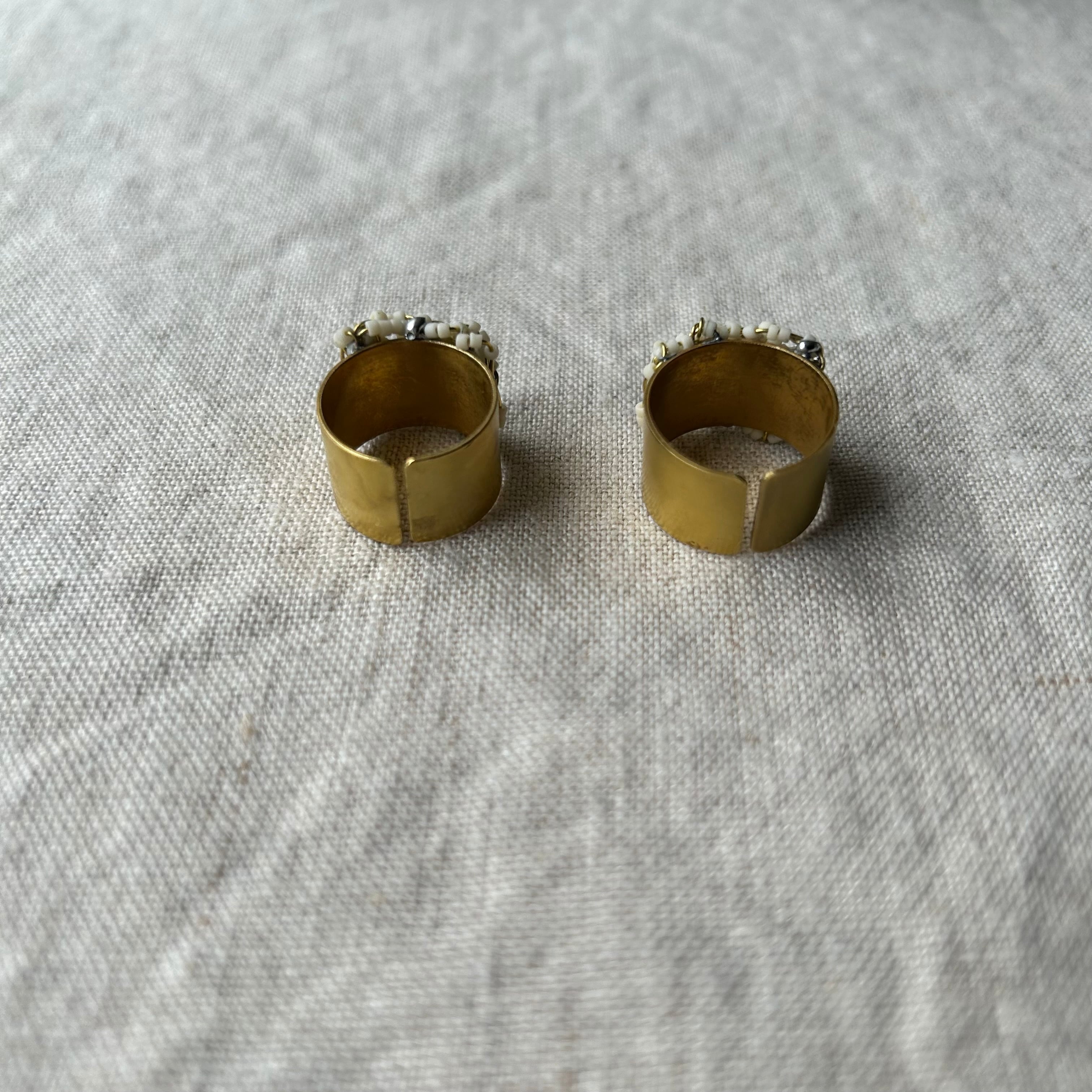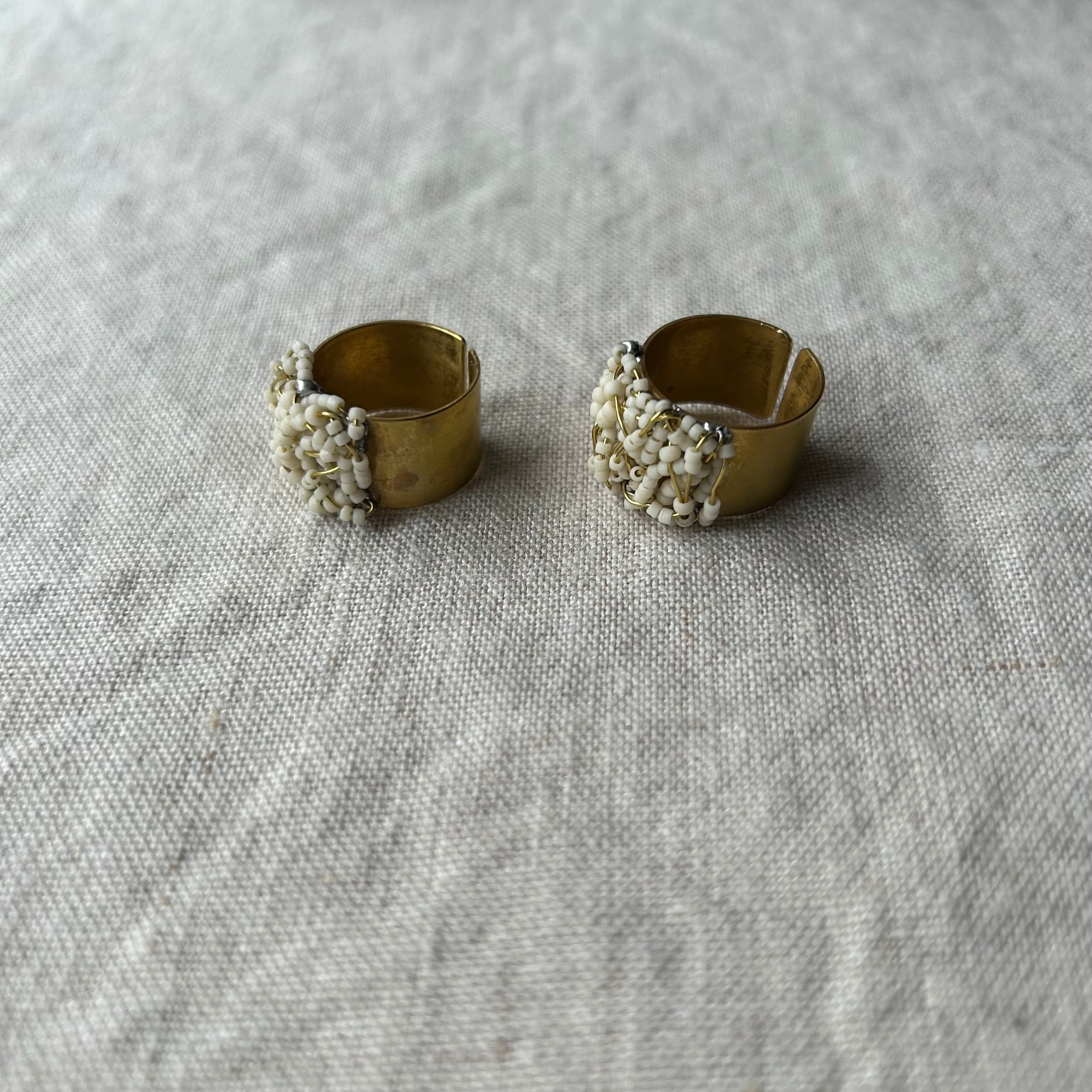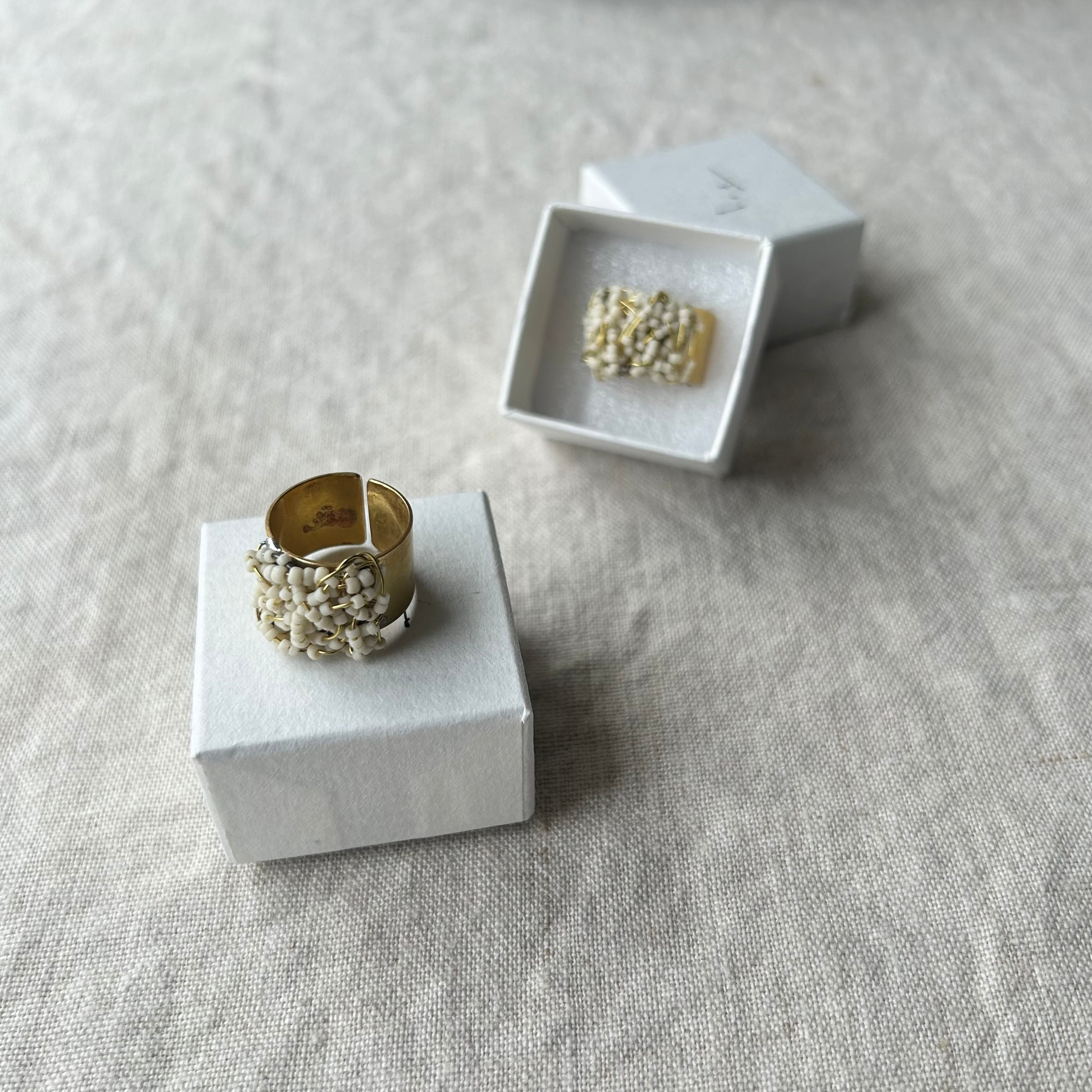 真鍮のリングに、アイボリーカラーのビーズと真鍮ワイヤーで飾り、仕立てられたリング