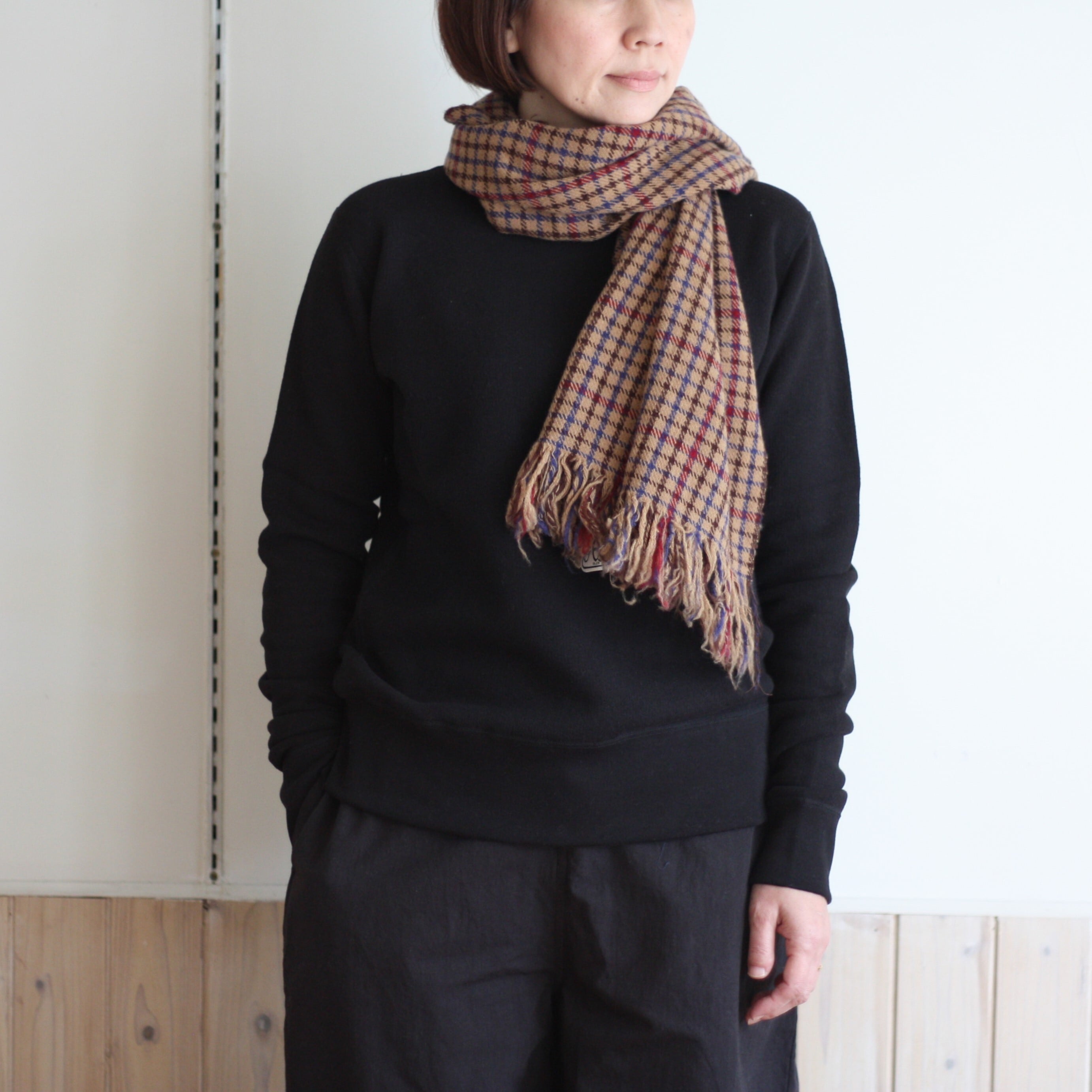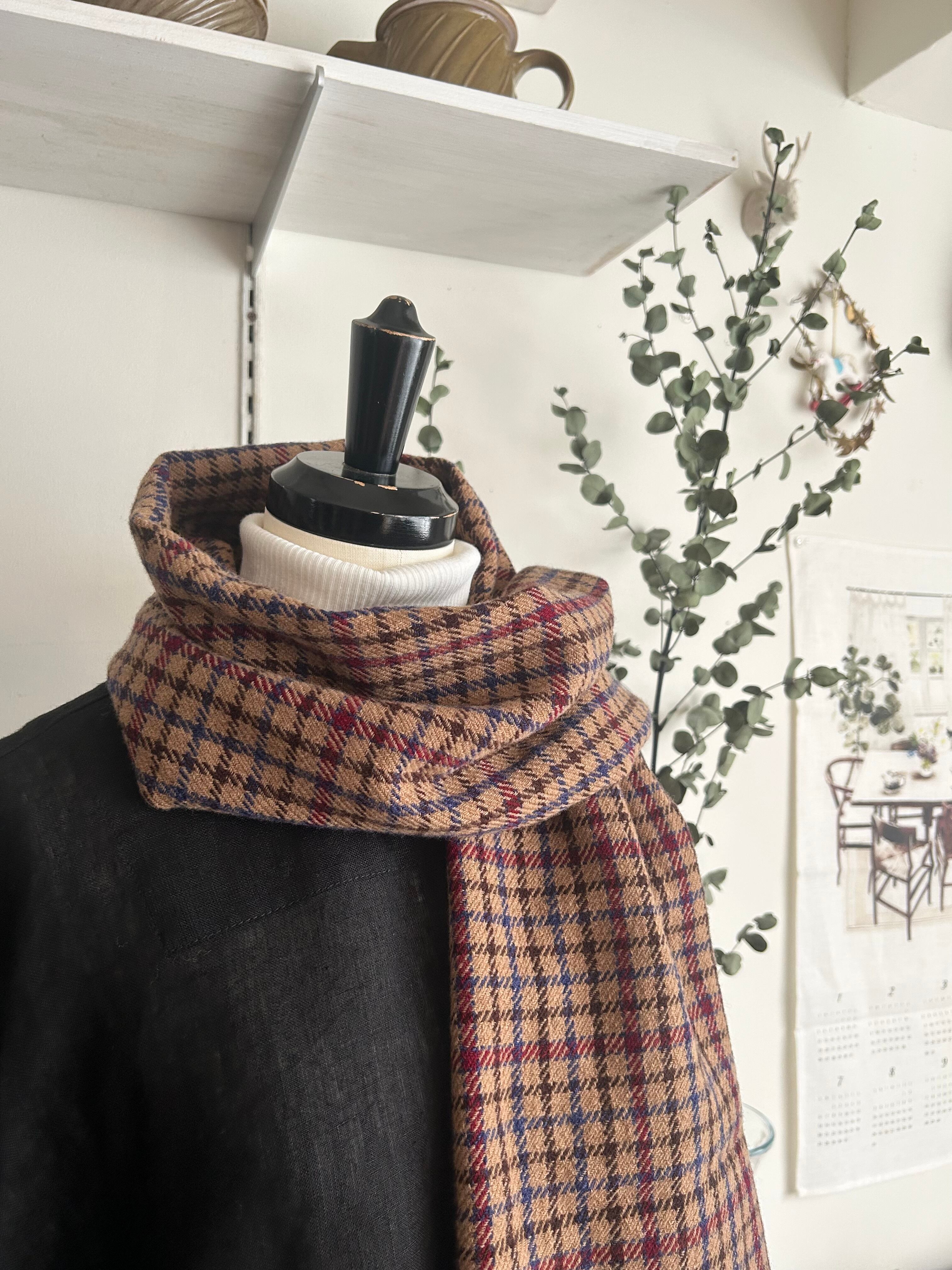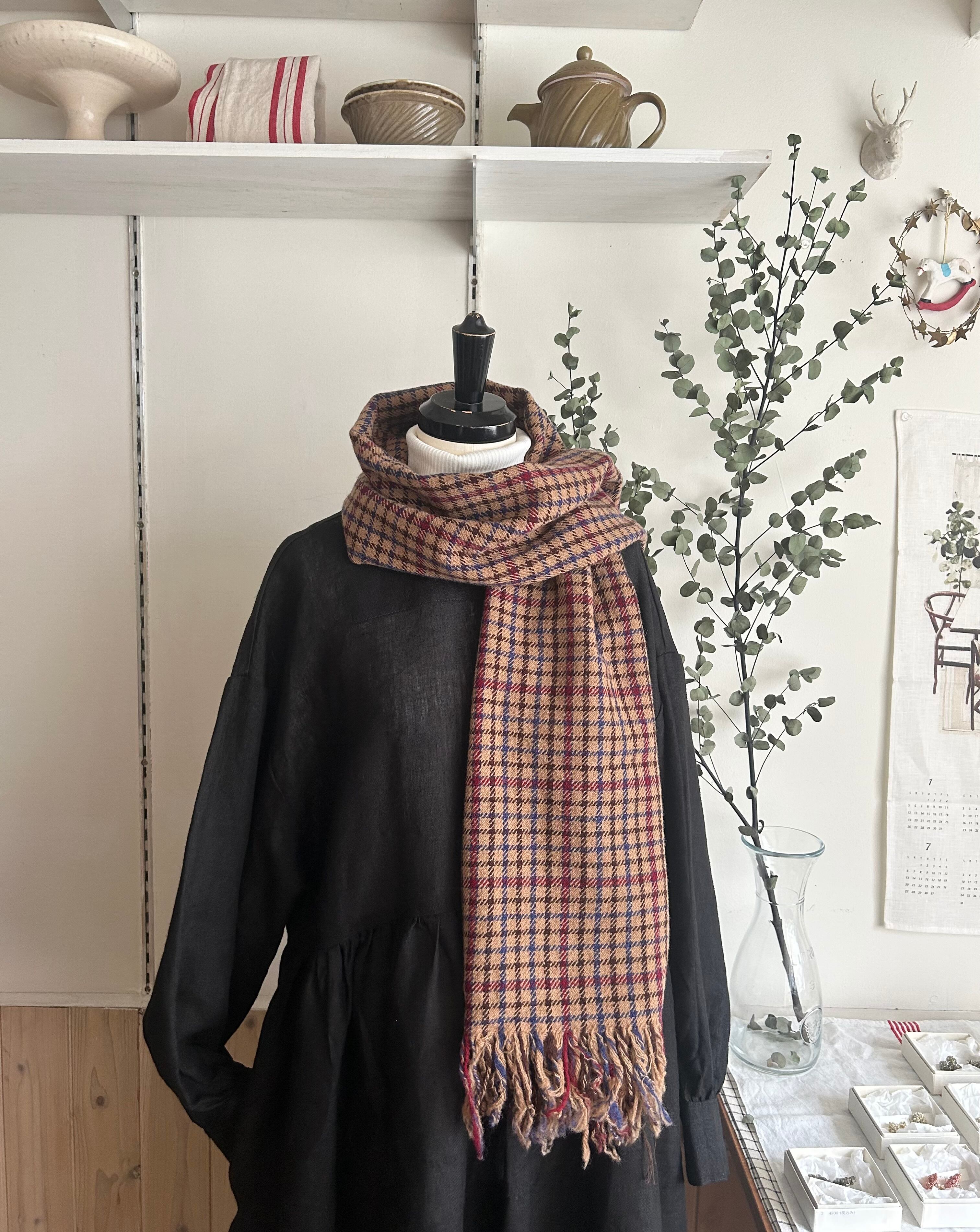 トラッドなチェック柄ながら、色合わせがやさしくコートやニット等いつもの装いになじむ一枚です。