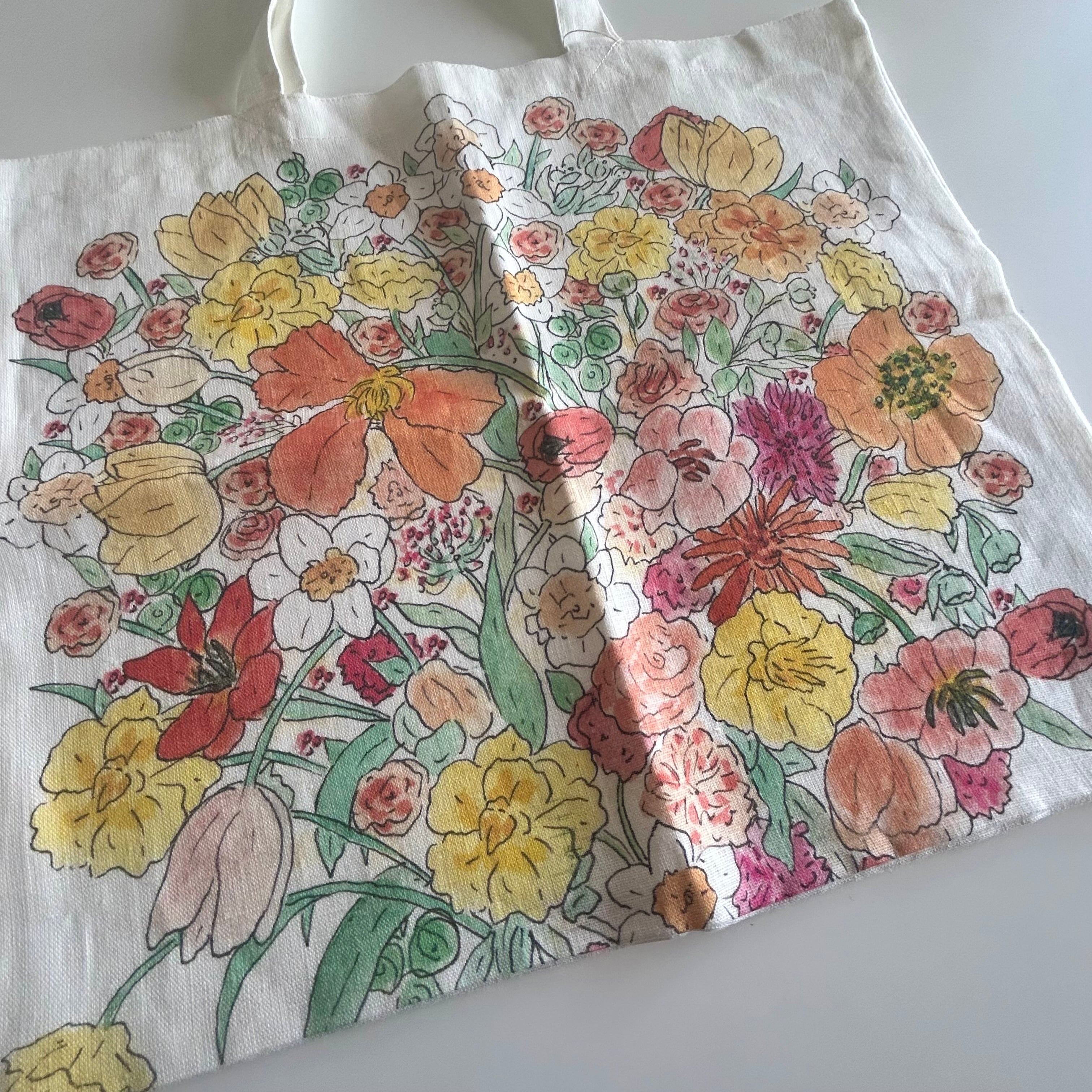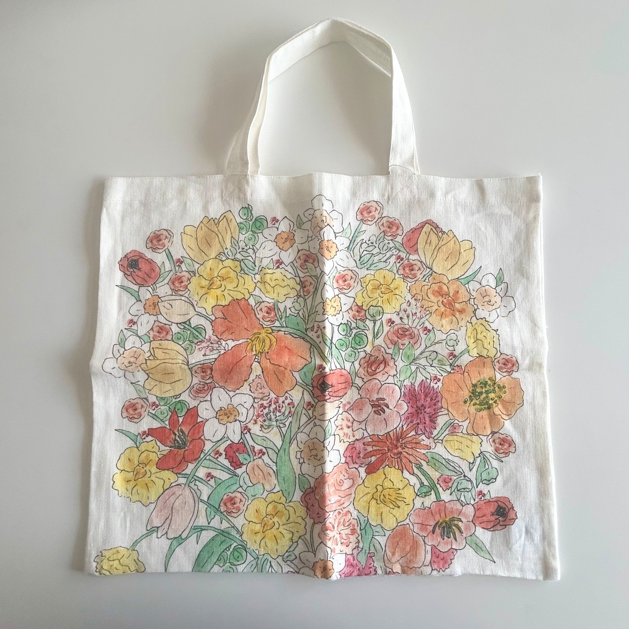 人気のファブリックカレンダー、イザベルボアノさんデザインの「うれしい花束」を使用して作ったフラットなバッグ。