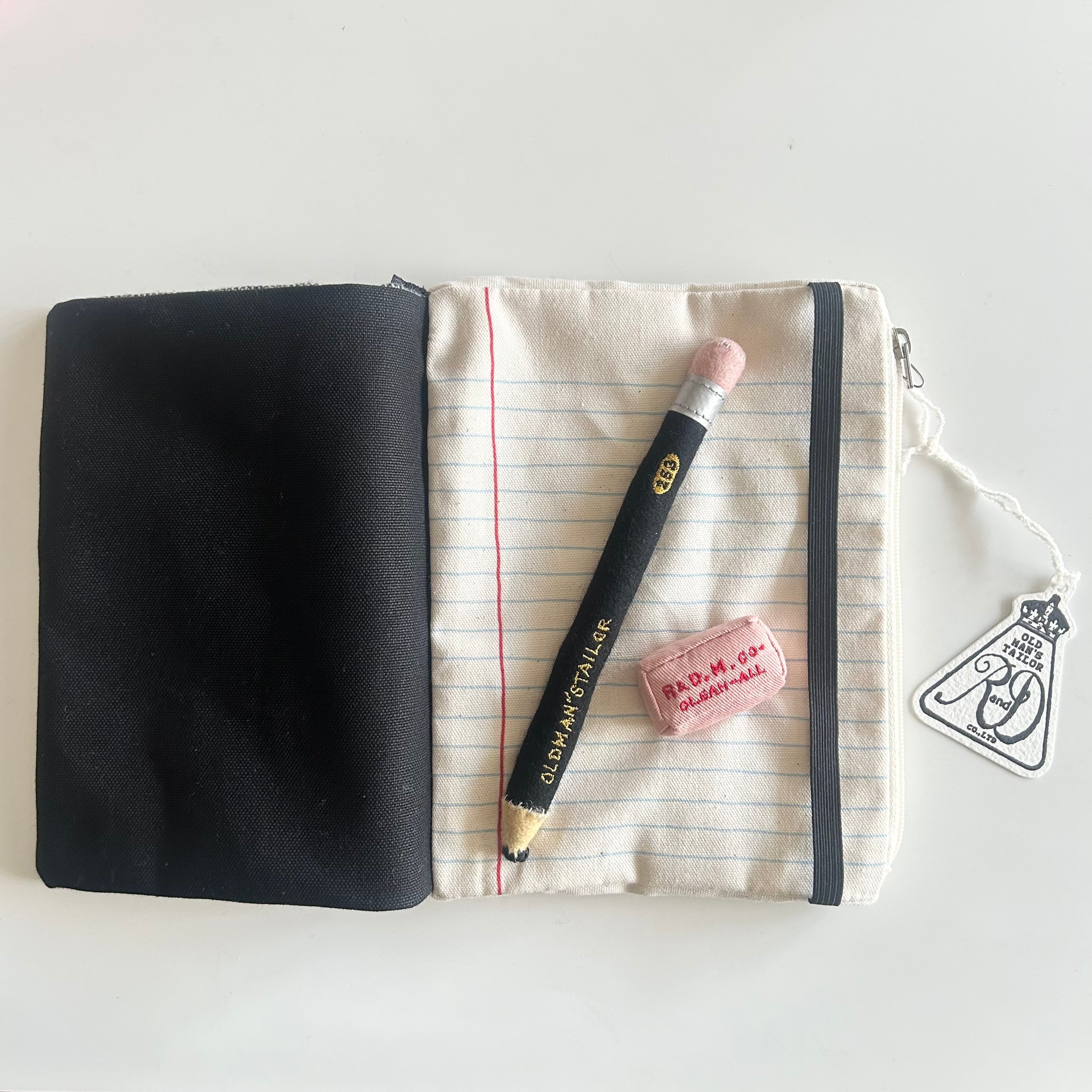 開くと鉛筆と消しゴムが縫い留められていて、その遊び心はさすがオールドマンズテーラー。