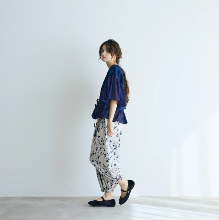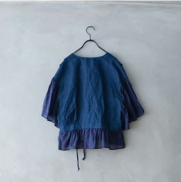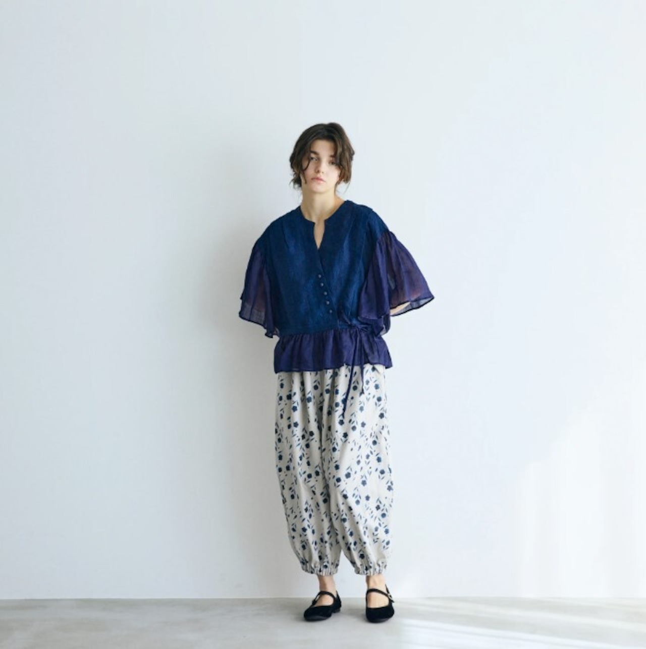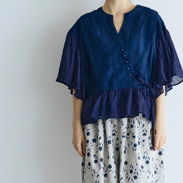 落ち着いたインディゴの色合いと、ふわりと広がる袖の軽やかさが印象的なカシュクールブラウスです。