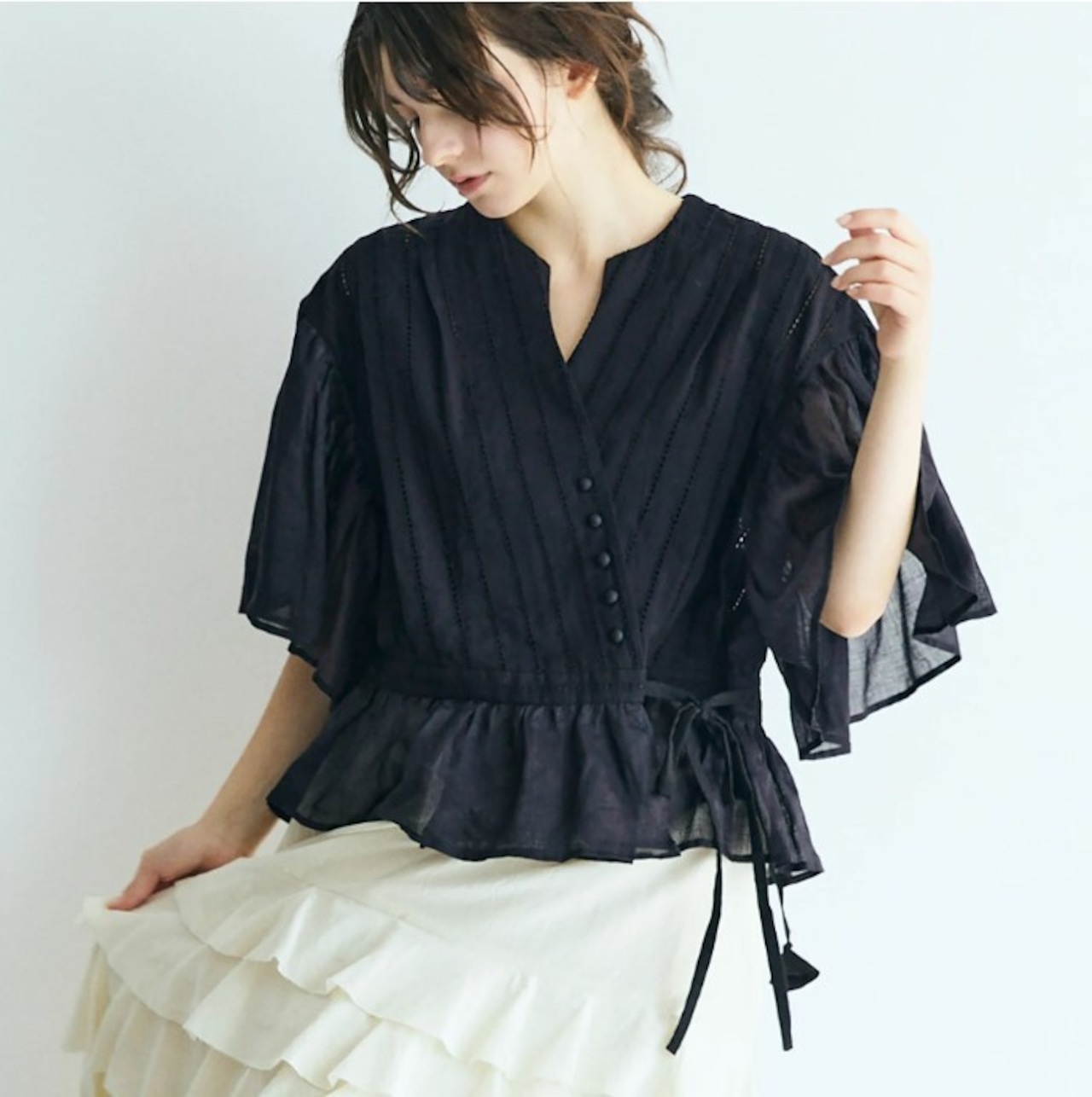 繊細なレースの表情が印象的な、カシュクール風ブラウスです。