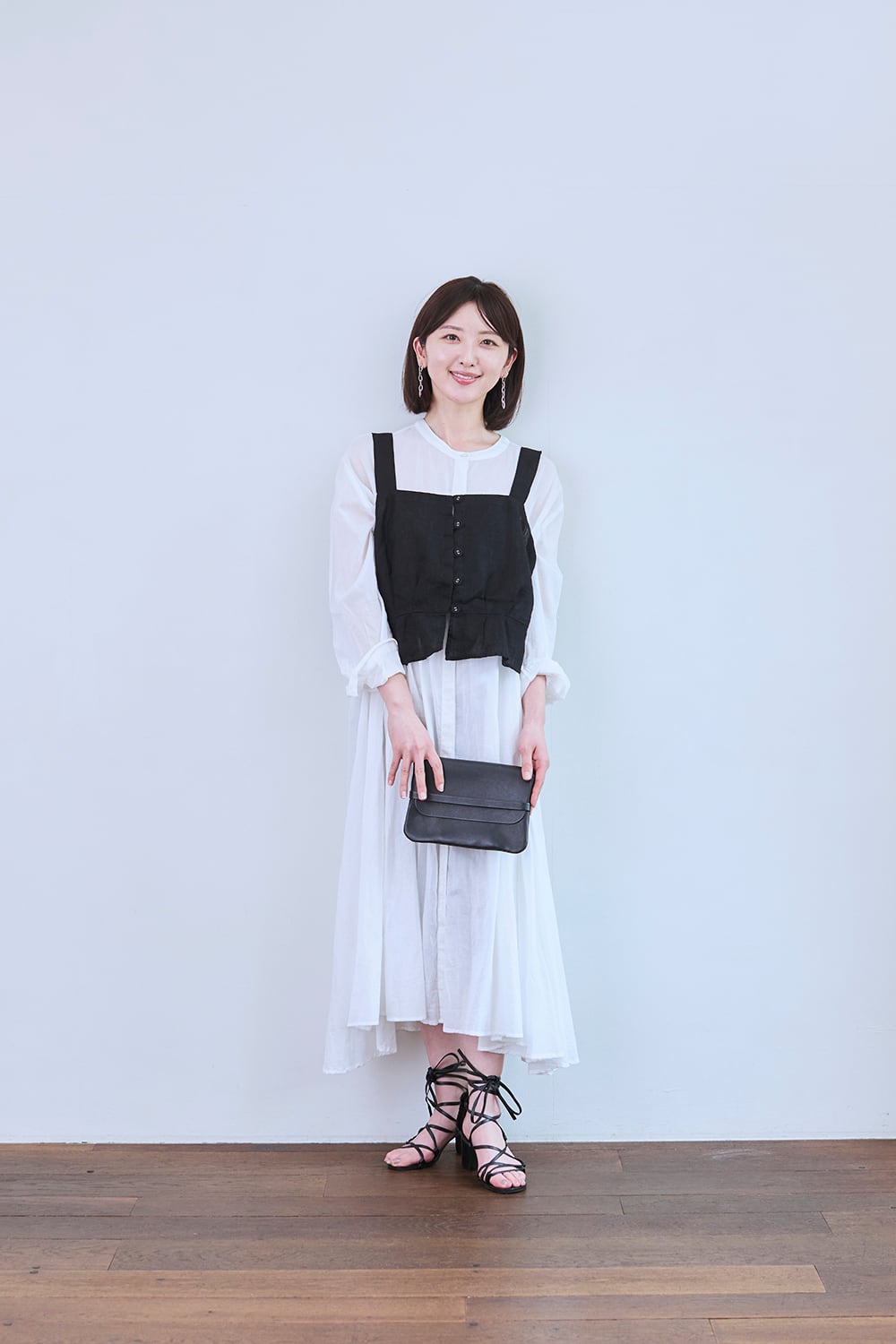 ショルダーストラップはボタンで長さ調節が可能。レイヤード次第で、着こなしの幅が広がる一枚です。