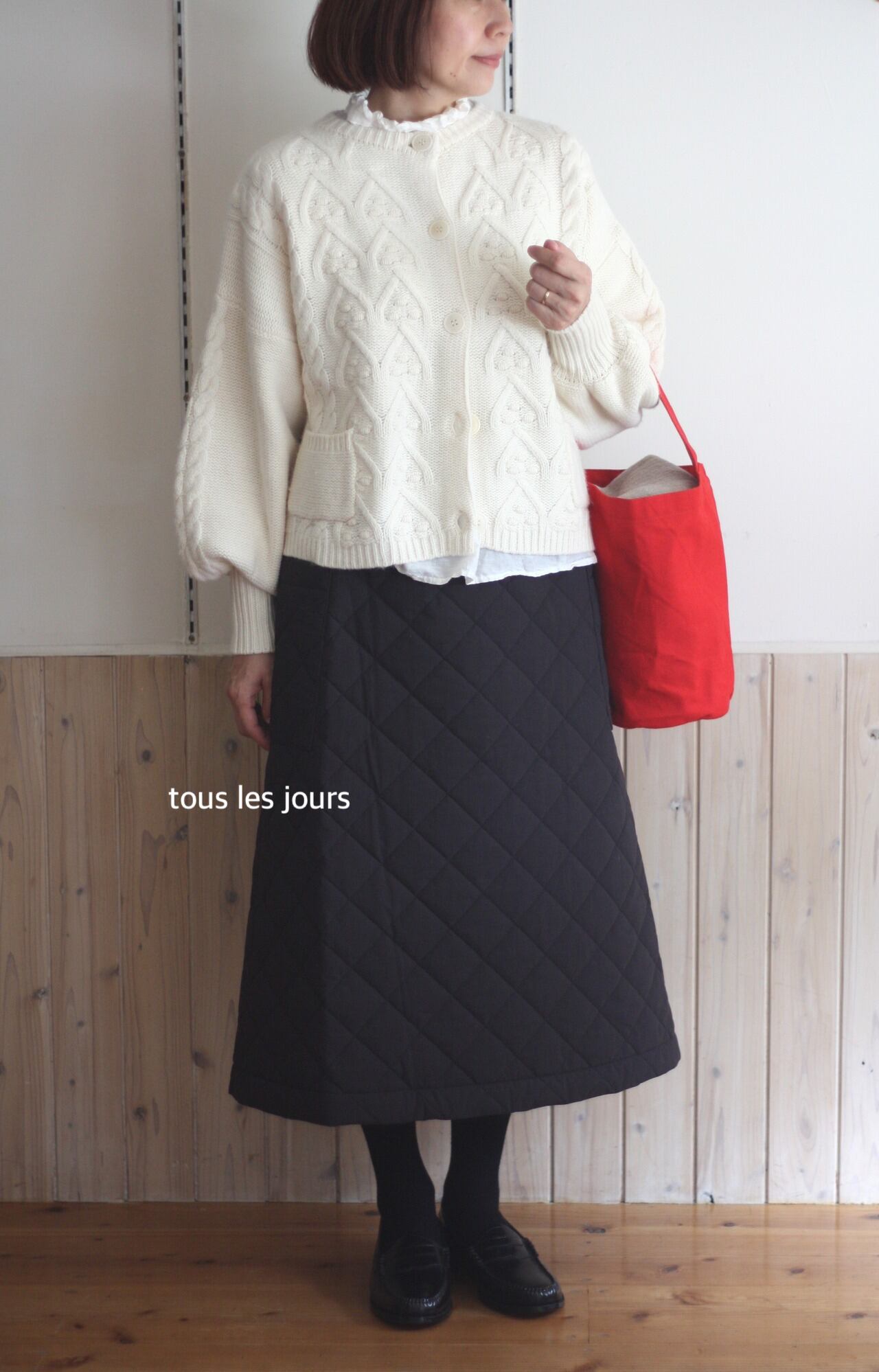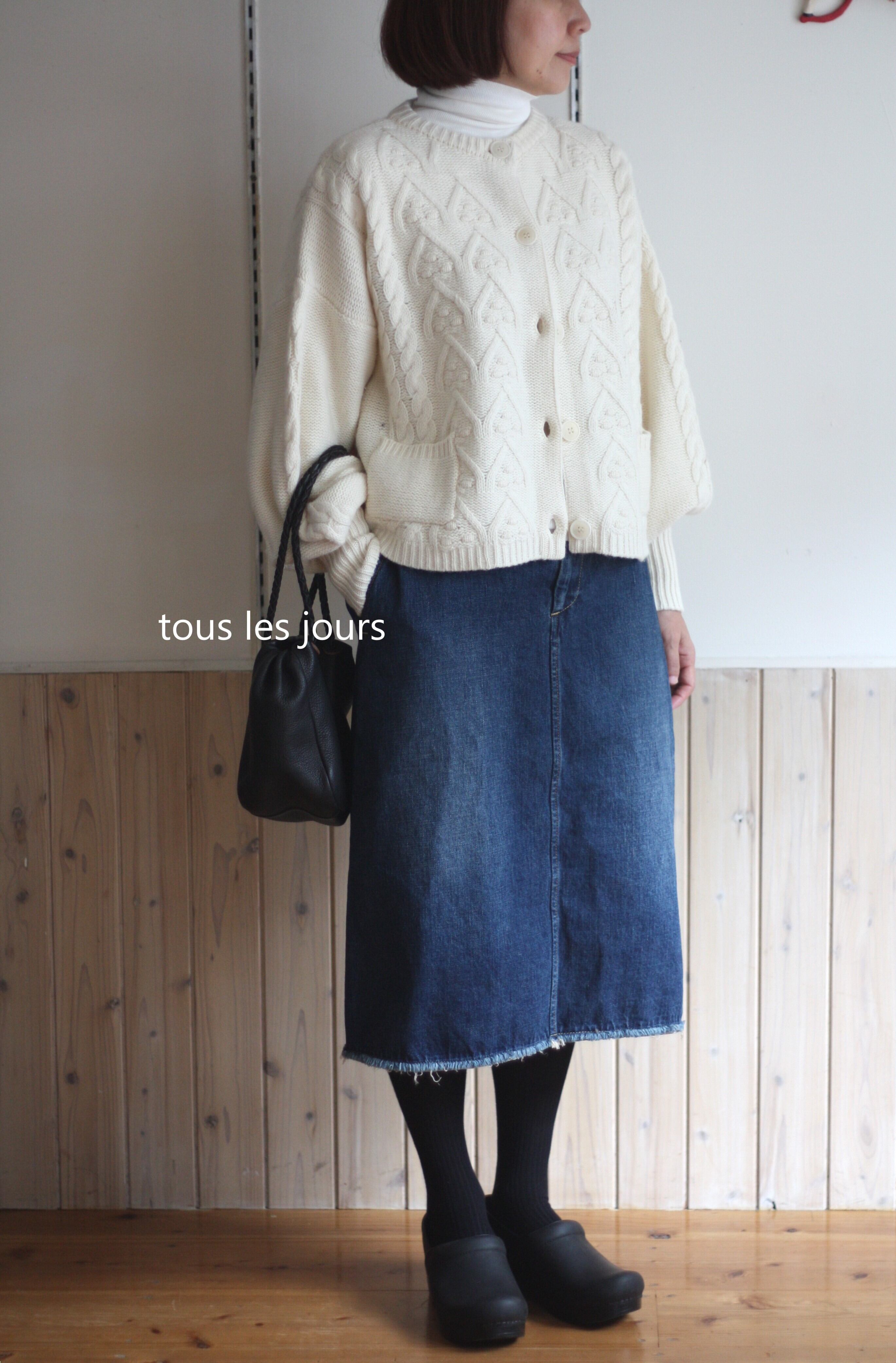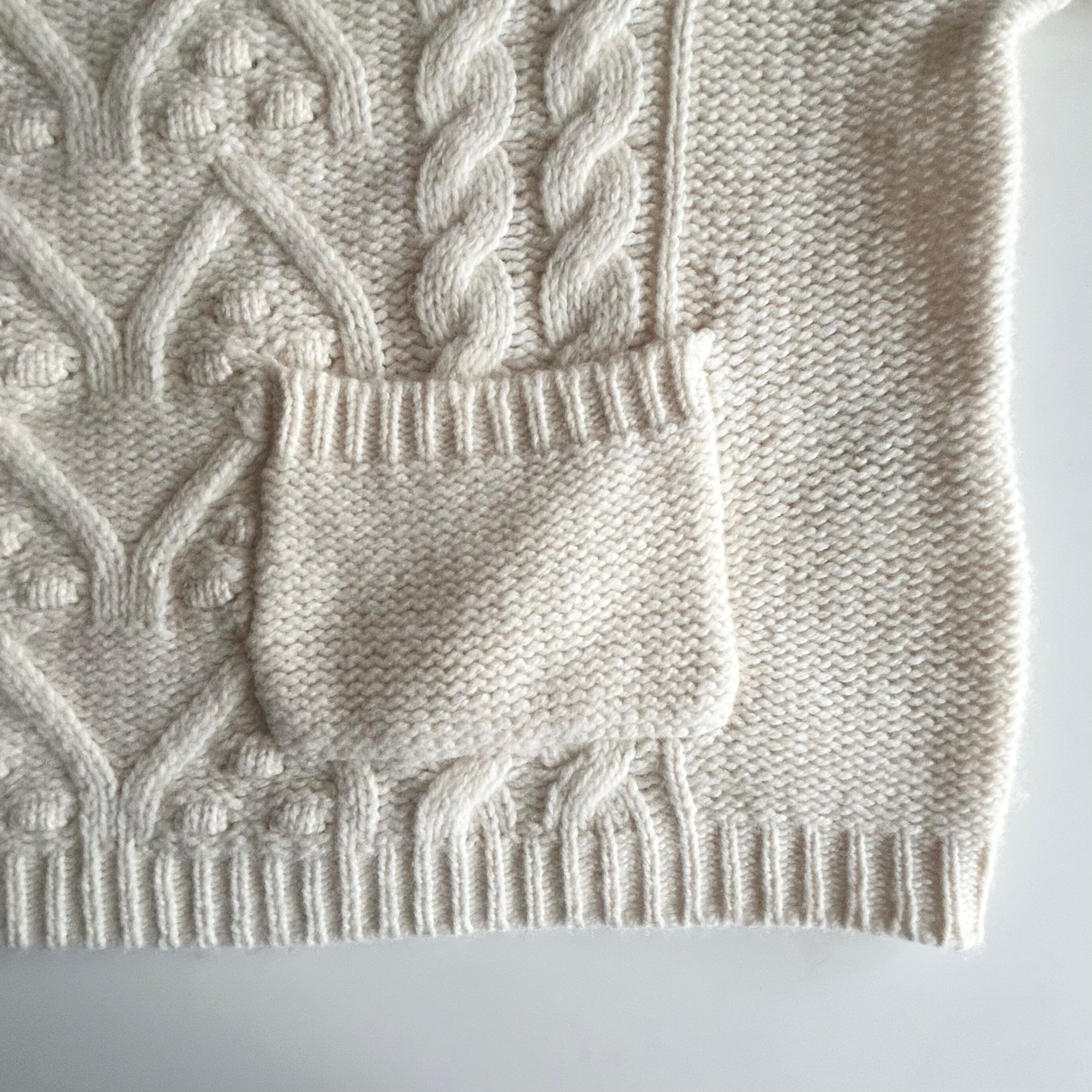 袖口のボリュームがこなれた印象のアランニットカーディガン。